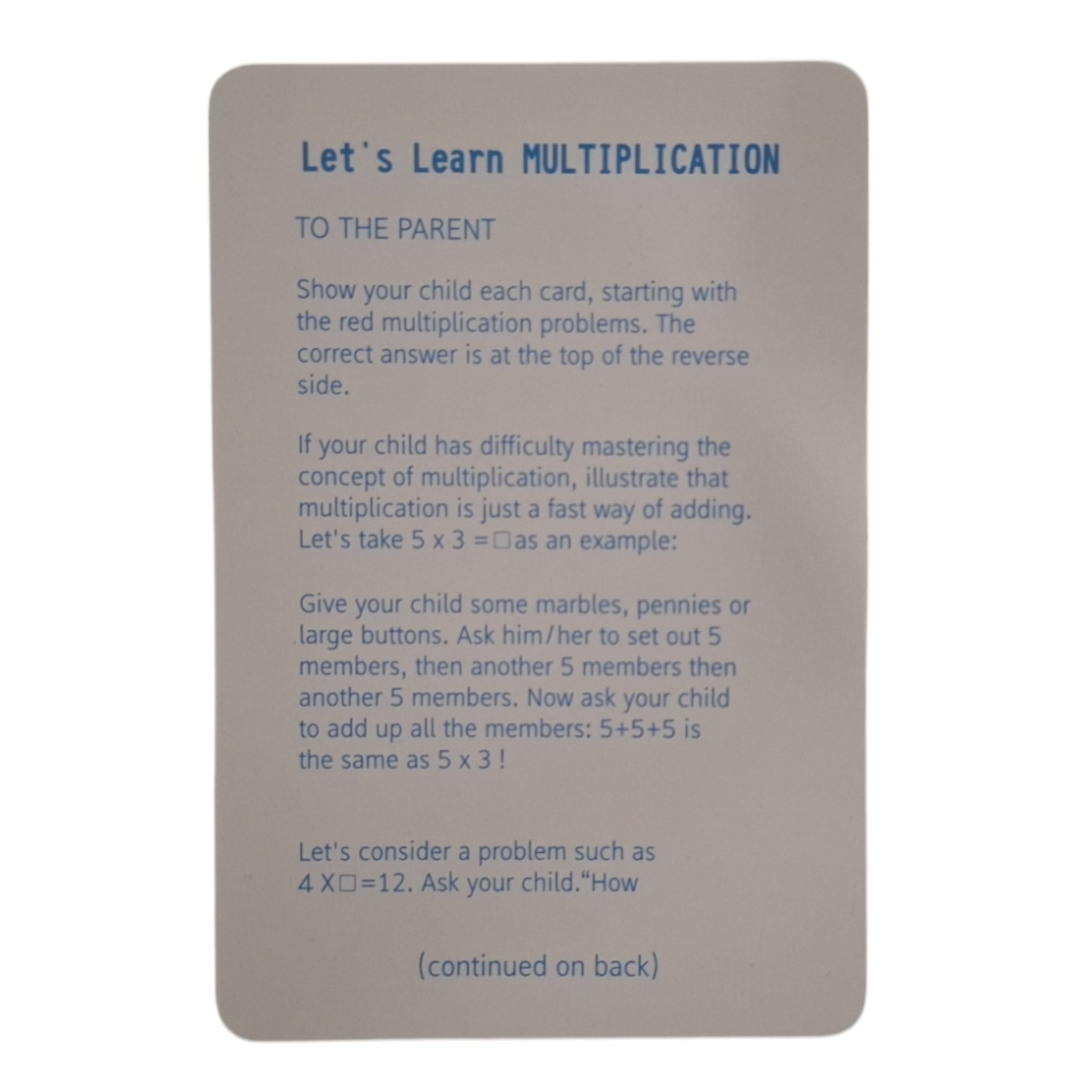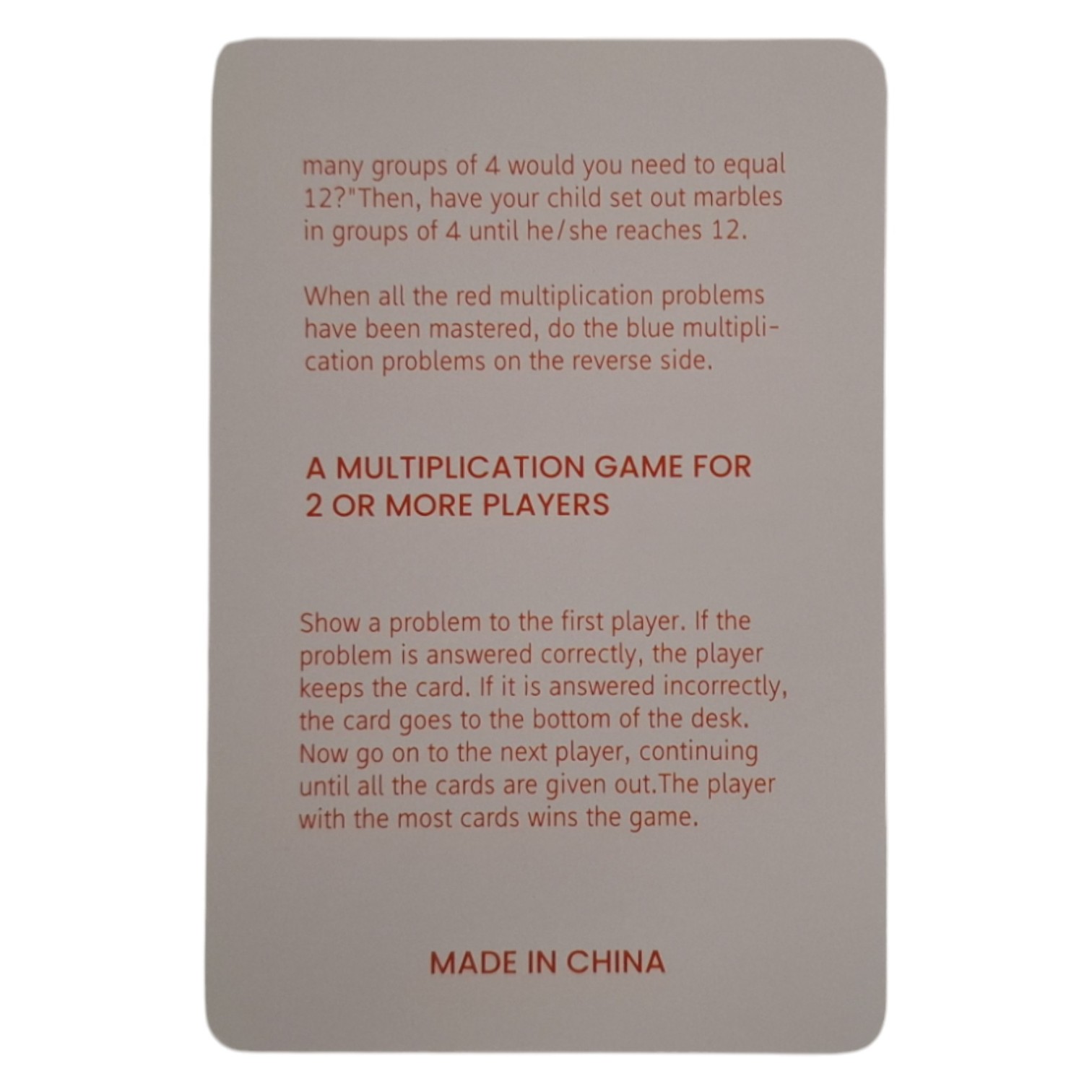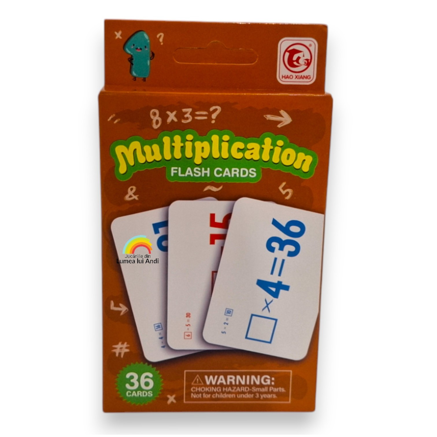 Acest set conține 35 de carduri din carton cu înmulțirea față-verso și 1 card cu instrucțiuni pentru părinți, în limba engleză.