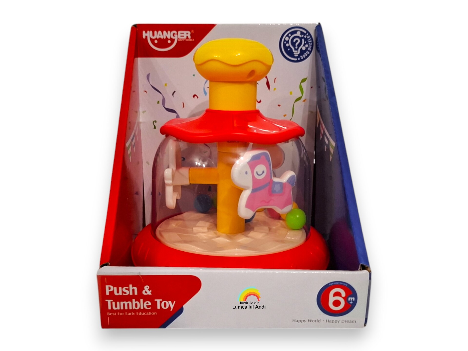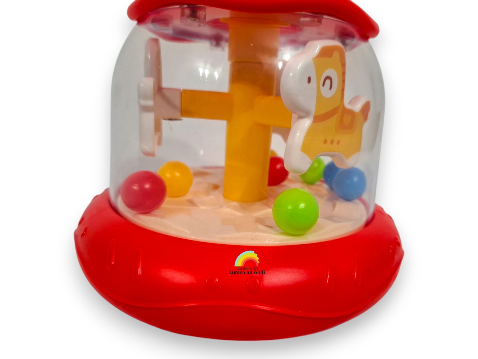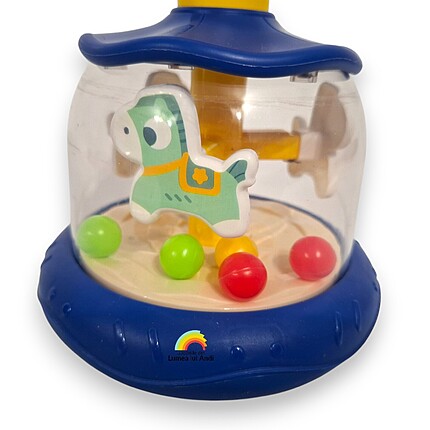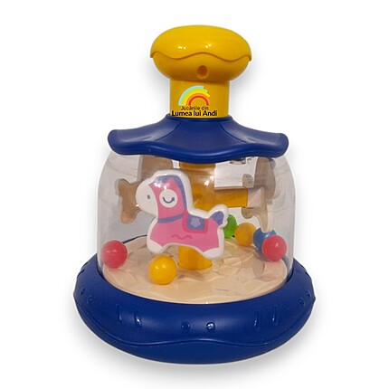După apăsarea butonului galben de deasupra caruselului, căluții se învârt ca într-un carusel adevărat, iar biluțele colorate „sar” în interiorul jocului garantându-le celor mici o distracție pe măsură.