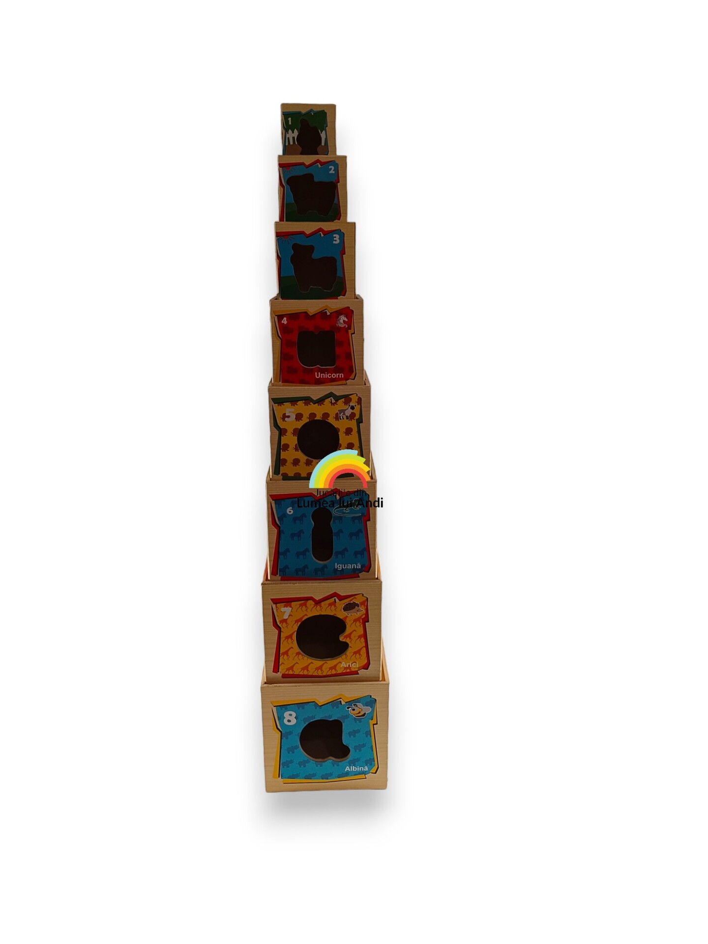 Cuburi de stivuit din lemn – Turn Montessori cu 8 cuburi din lemn cu forme, cifre și animale, limba română