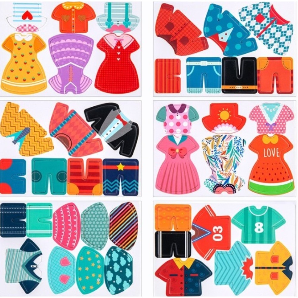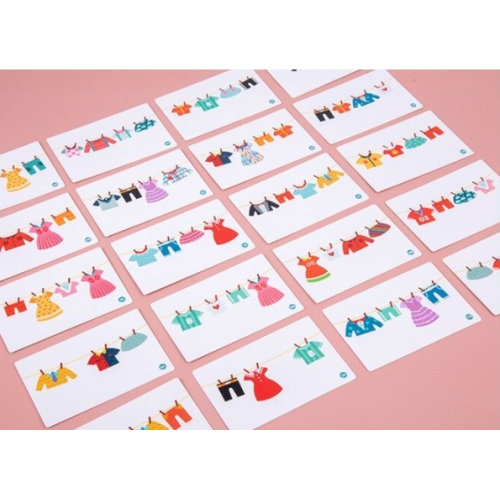 Aceleași piese vestimentare se pot folosi la întins pe sfoară, la uscat, iar pentru un grad de dificultate mai ridicat, copii vor trebui să asocieze modul în care sunt întinse hainuțele cu modelele afișate pe planșele incluse.