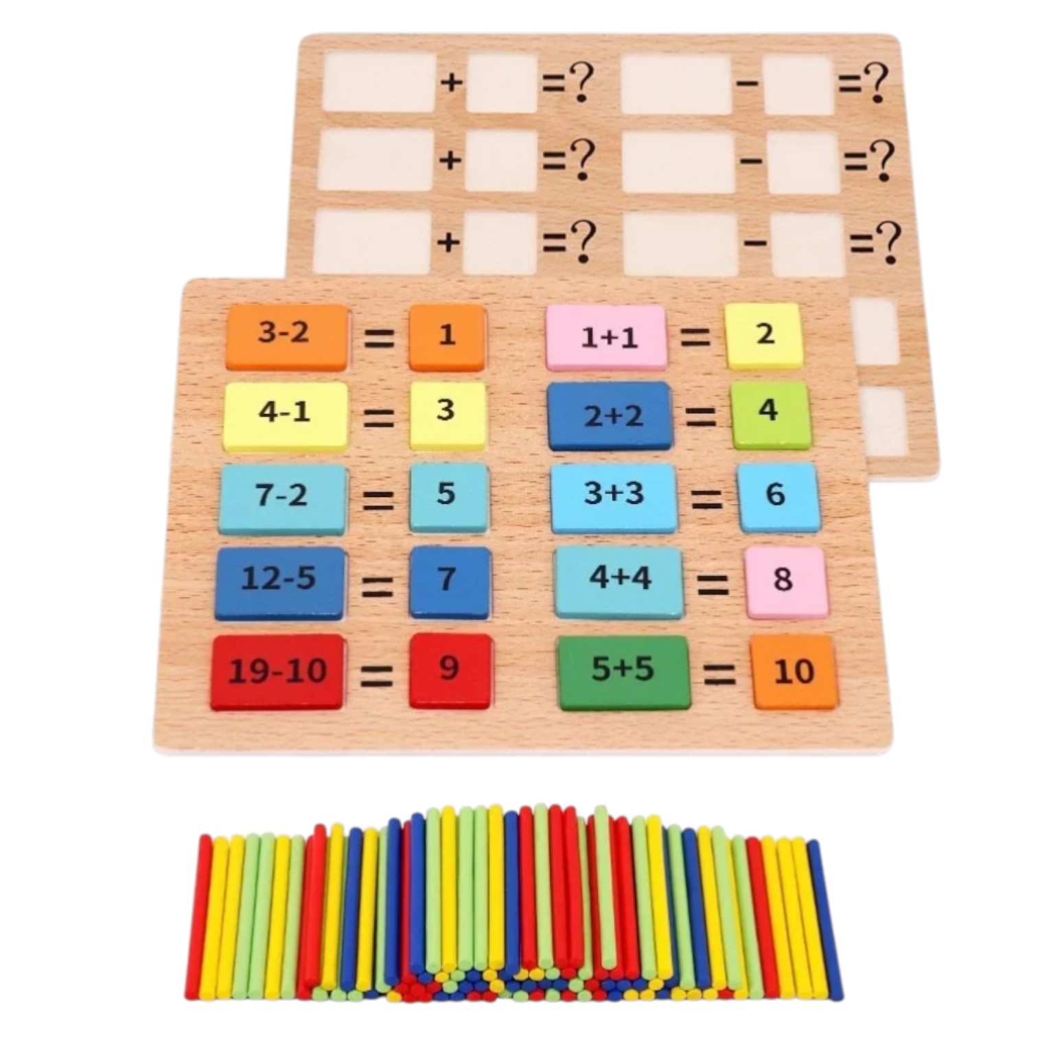 Joc aritmetic din lemn cu planșe, jetoane și bețișoare, pentru calcule matematice simple (adunare și scădere), 155 piese