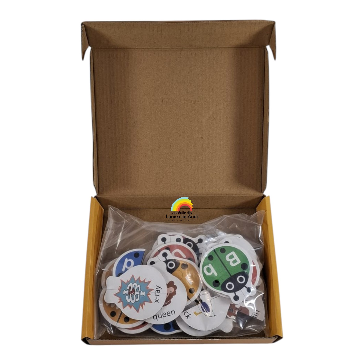 Acest set conține 52 de piese care se asamblează 2 câte 2 formând 26 de gărgărițe de diferite culori (roșii, verzi, albastre, roz, galbene). Fiecare piesă conține o literă mare de tipar sau o literă mică de tipar care se asociează formând astfel o gărgăriță colorată sau pe verso un animal, fructe, aliment, mijloc de transport, etc, însoțit de cuvântul respectiv în limba engleză. În acest fel, cei mici vor putea corela litera mare/mică cu imaginea sau cuvântul în limba engleză.
