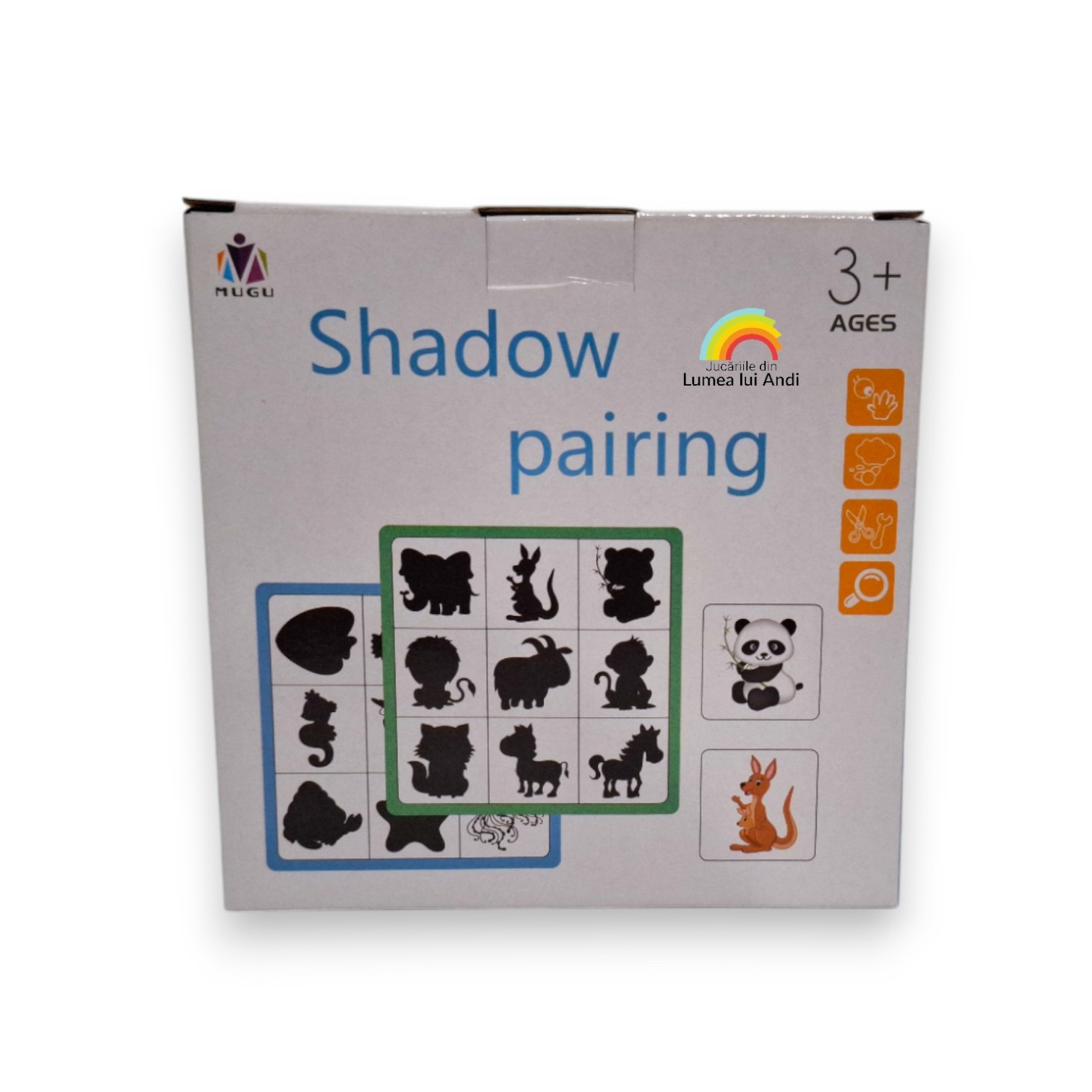 Copilul trebuie să facă asocierea între cele 36 de piese cu imagini color și umbrele acestora de pe cele 6 planșe din carton, cu imagini asortate față-verso.