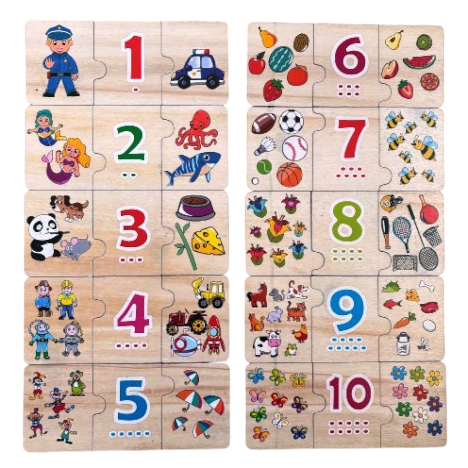 Fiecare grup conține câte 3 piese: o piesă centrală cu o cifră (de la 1 la 10) și 2 piese laterale care conțin animale sau obiecte în numărul corespunzător, de exemplu POLIȚIST – 1 -MAȘINĂ DE POLIȚIE sau ANIMALE DOMESTICE – 9 – ALIMENTE PE CARE LE MĂNÂNCĂ SAU LE PRODUC ANIMALELE, etc.
