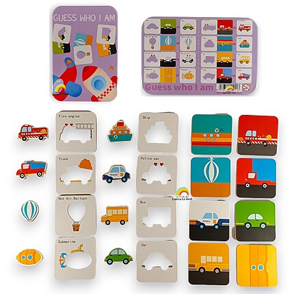 Fiecare din cele 8 modele din set este alcătuit din câte 3 piese : pe prima piesa regăsim imaginea completă, a doua piesă conține un șablon cu formă, iar cea de-a treia piesă va putea fi folosită pentru a întregi șablonul.