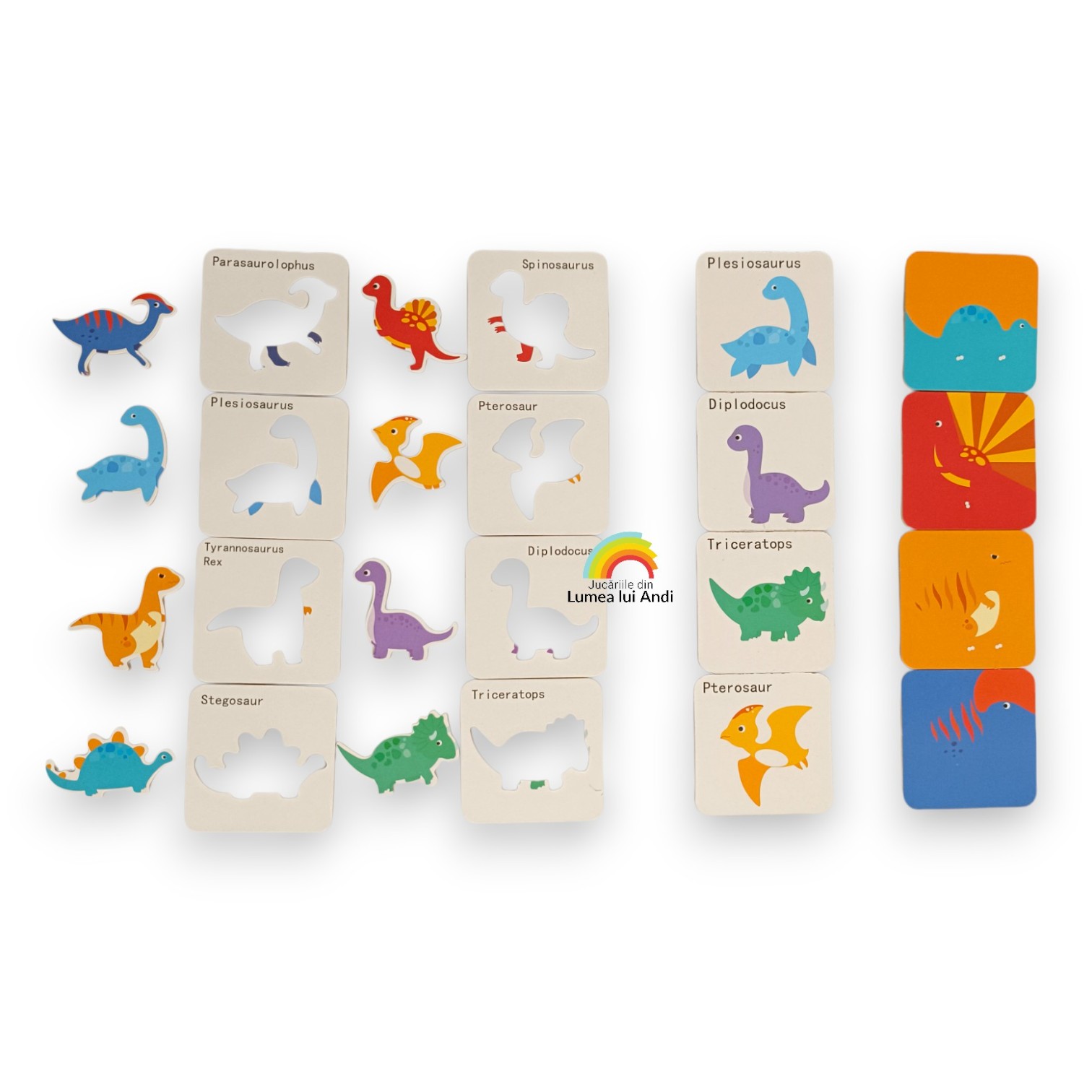 Fiecare din cele 8 modele din set este alcătuit din câte 3 piese : pe prima piesa regăsim imaginea completă, a doua piesă conține un șablon cu formă, iar cea de-a treia piesă va putea fi folosită pentru a întregi șablonul.