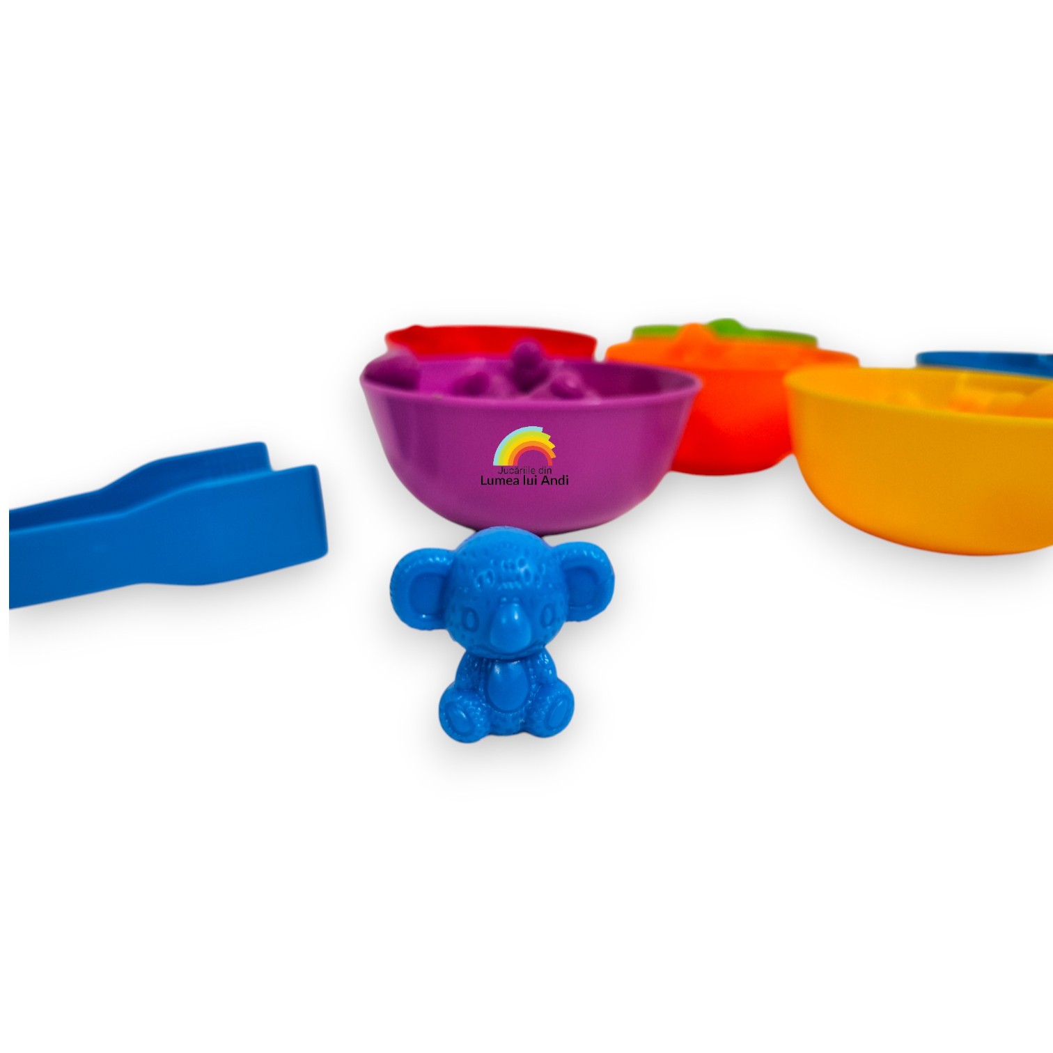 Se pun toate animalele amestecate pe suprafața de joacă, iar cu ajutorul pensetelor incluse, copiii vor prinde căte un animăluț și îl vor așeza în cupa de aceeași culoare.