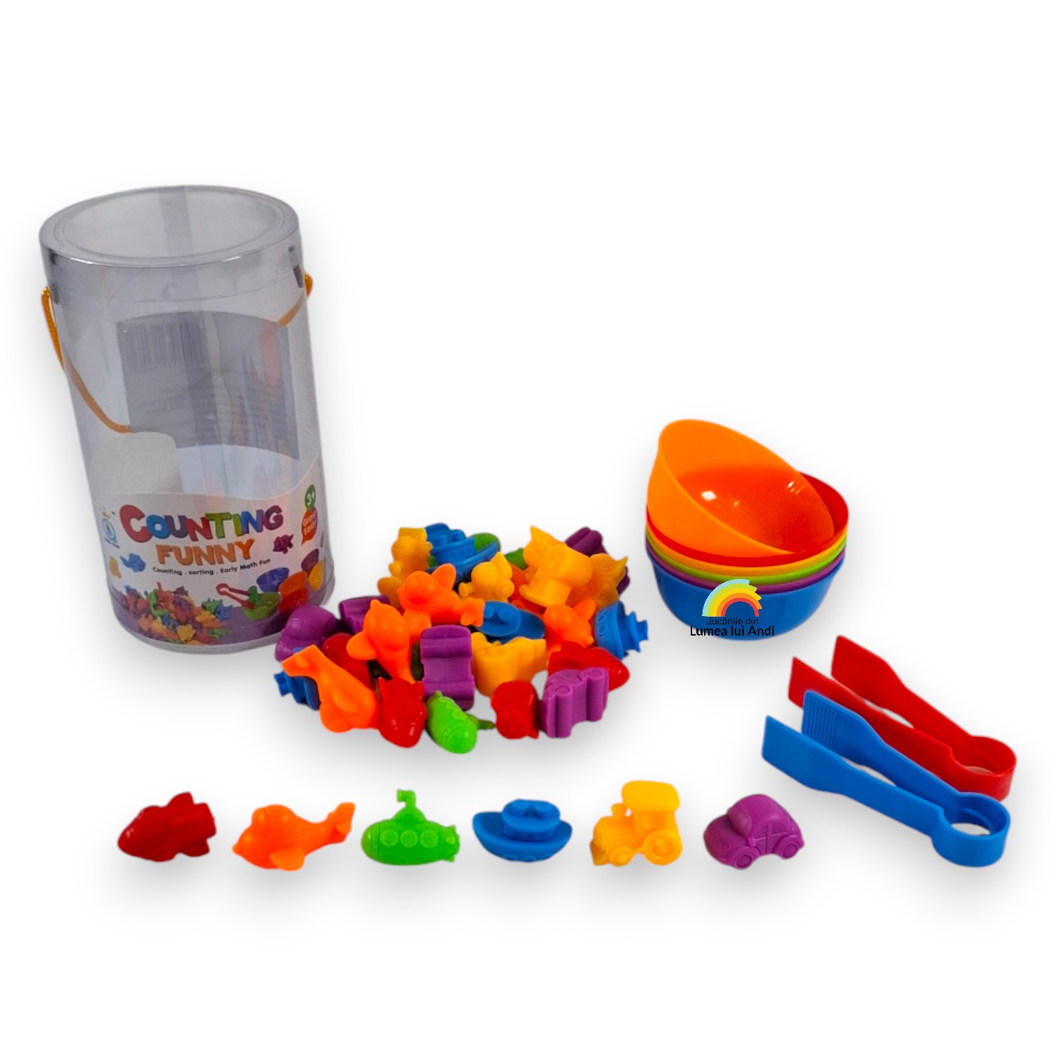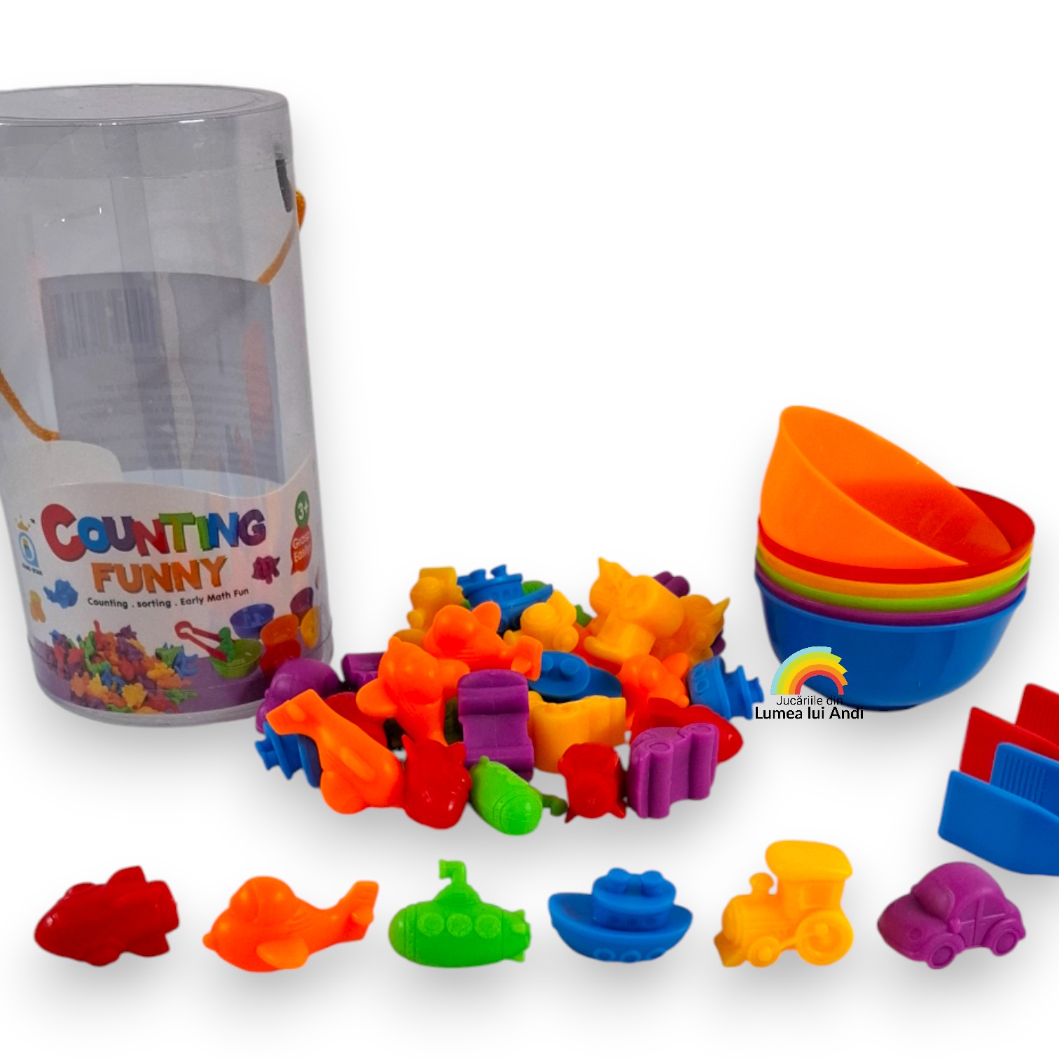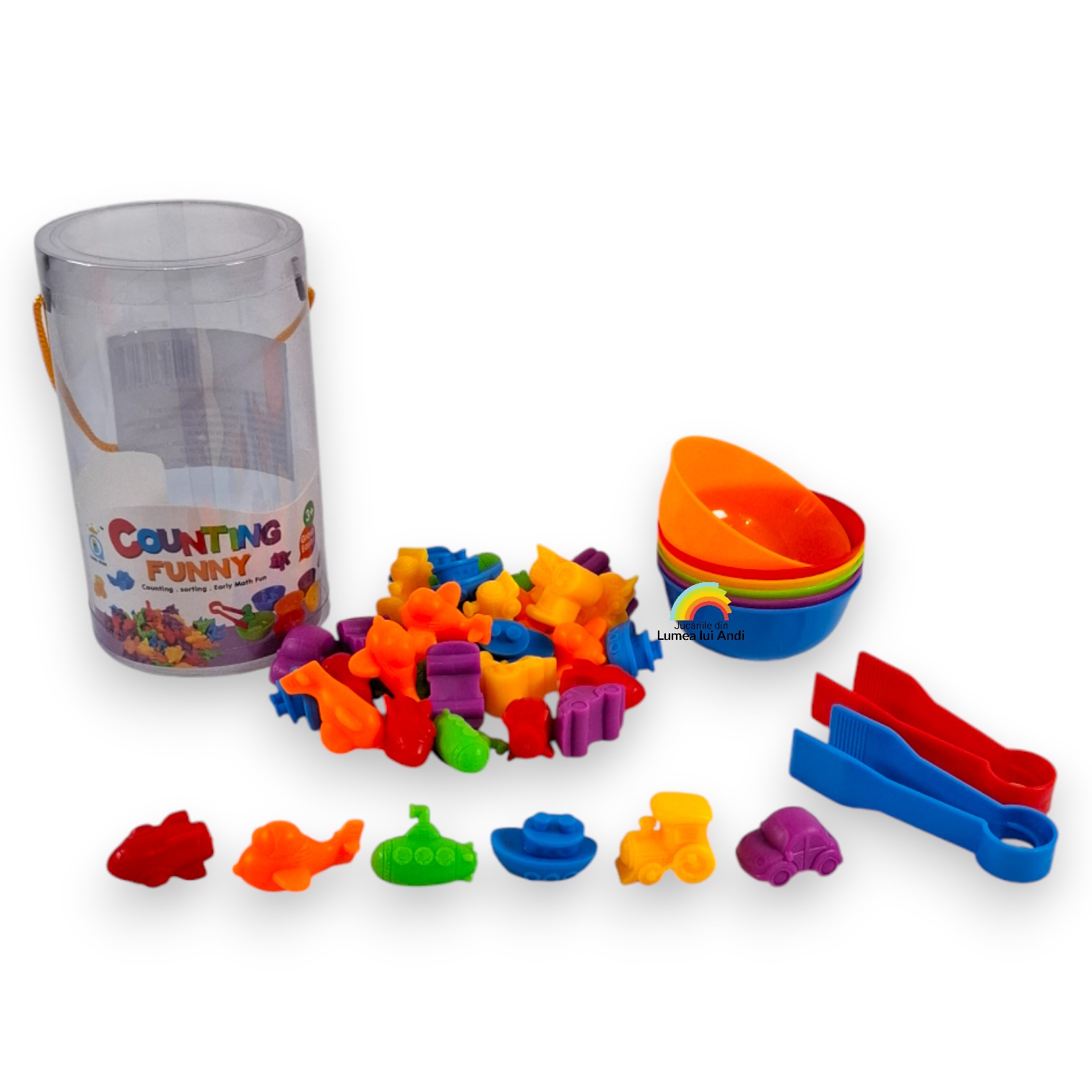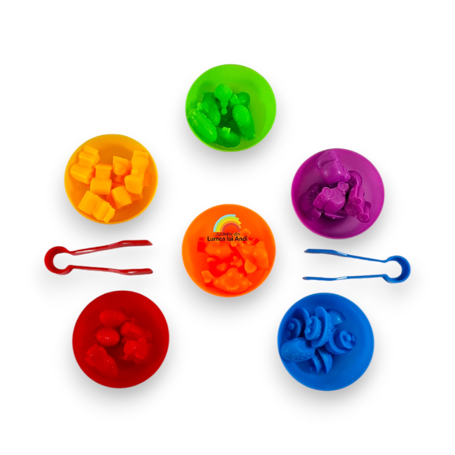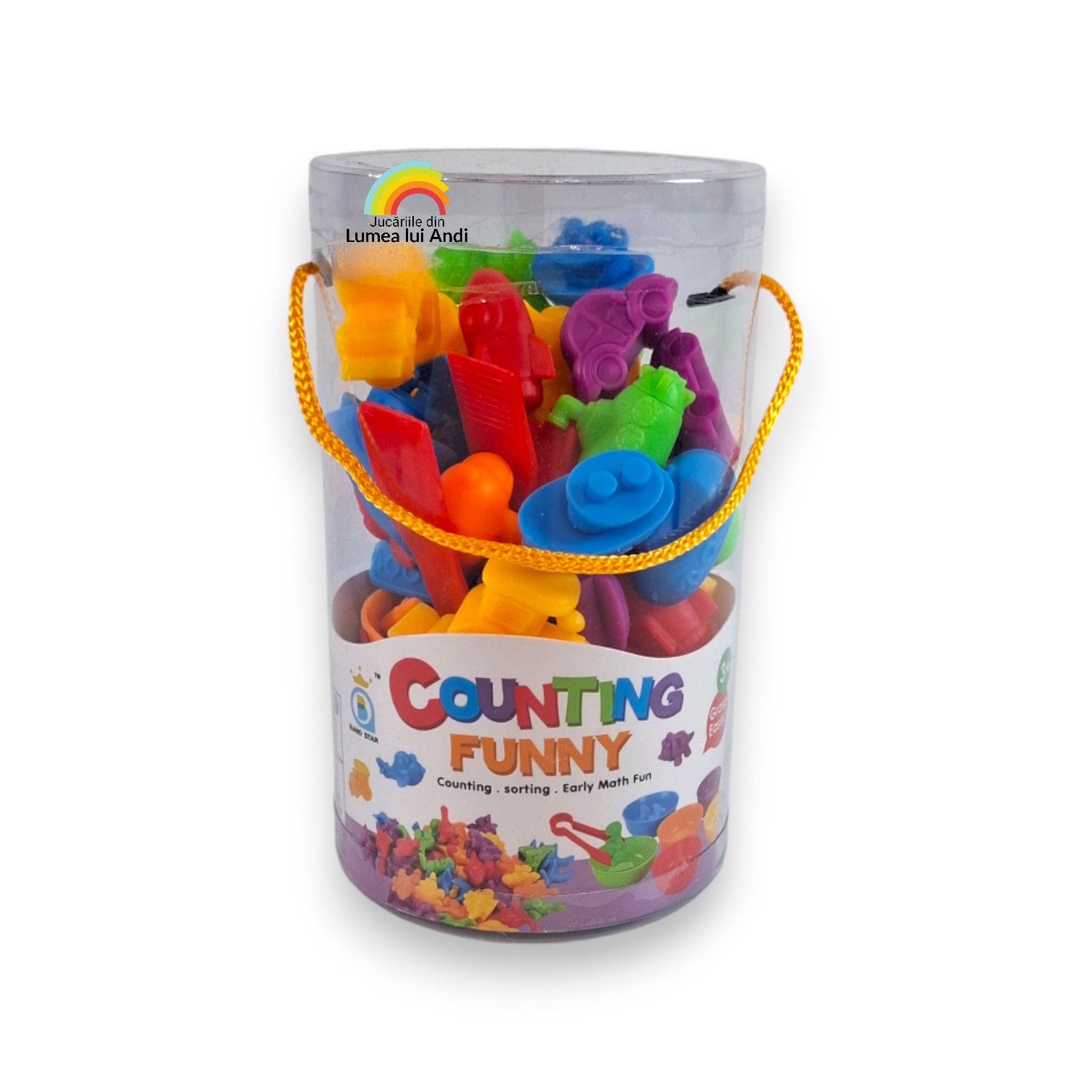 Jocul de sortare culori, asociere și numărat cu 36 de piese este un joc de clasificare pe culori și de numărat. Este un joc care dezvoltă motricitatea fină și dexteritatea celor mici, abilitățile cognitive și sociale.