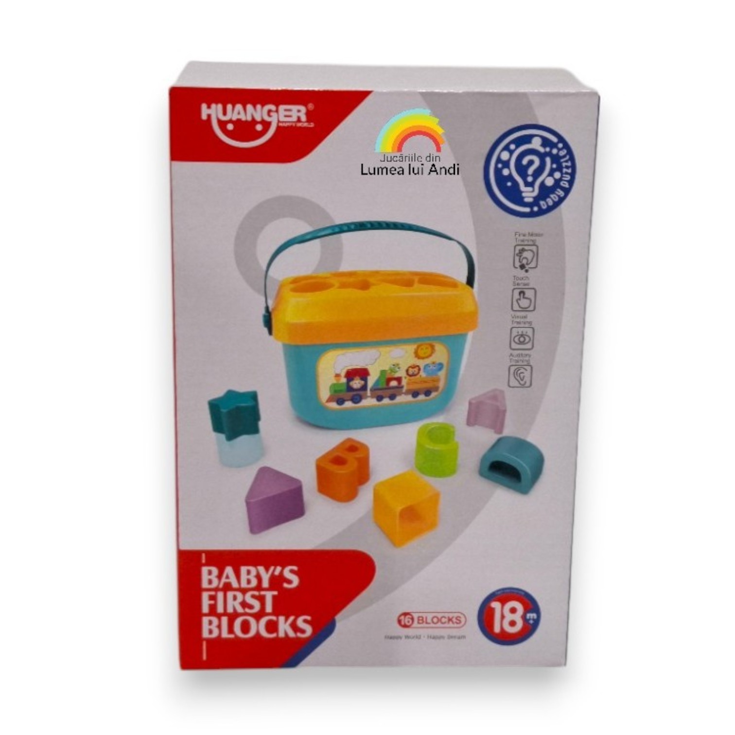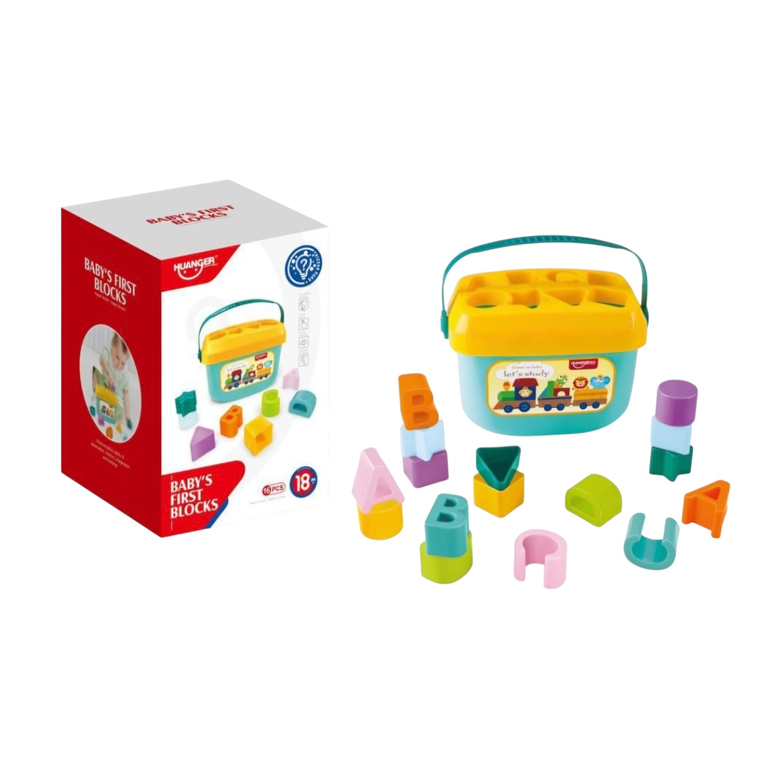 Acest set este confecționat din plastic rezistent și conține o găletușă din plastic, cu un capac special detașabil ce are 8 spații pentru sortarea celor formelor geometrice colorate și a literelor de tipar. Găletușa are mâner, iar astfel poate fi transportată cu ușurință de cei mici, atât prin casă, cât și afară sau pe drum, în mașină. După ce toate cele 16 piese au fost sortate, capacul se deschide cu ușurință pentru a scoate formele , iar apoi se poate relua sortarea.