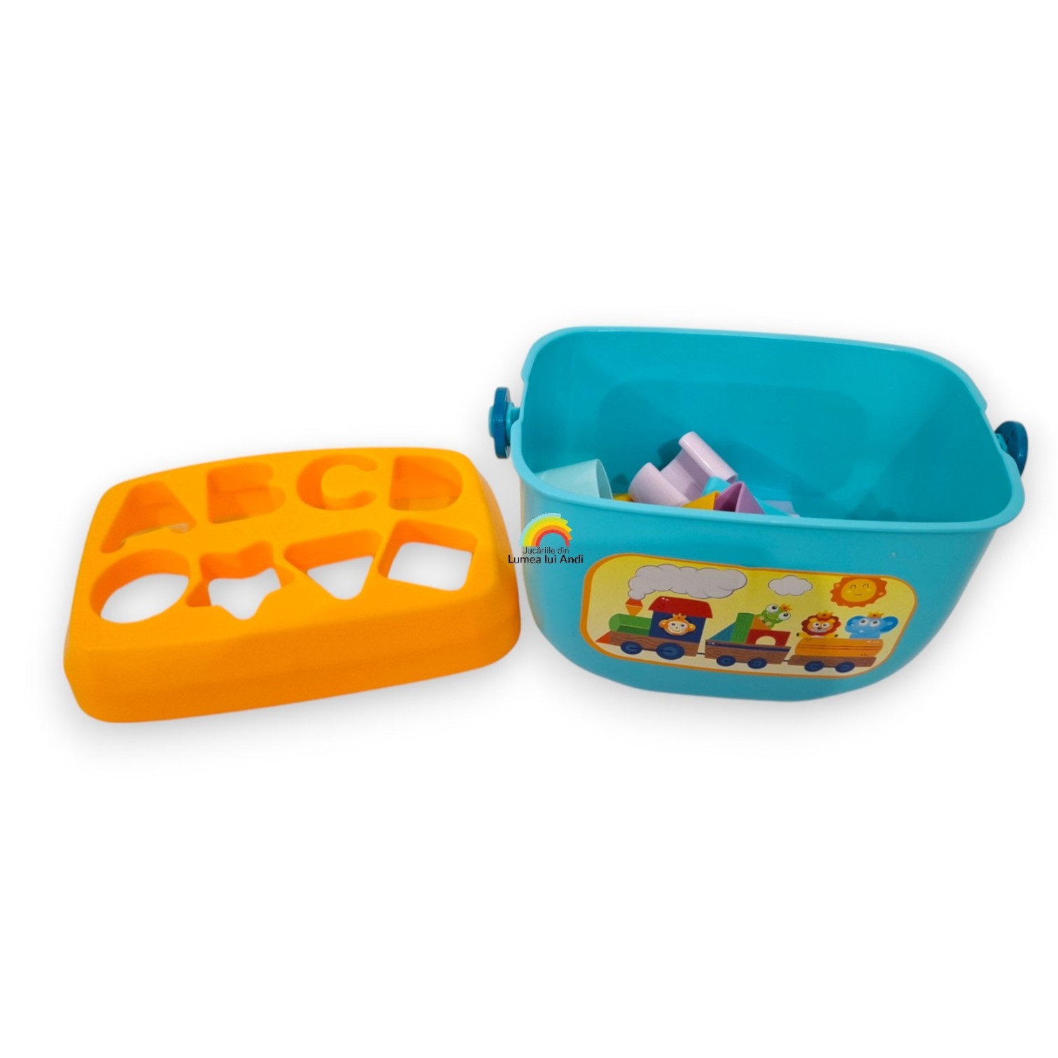 Joc de sortare forme geometrice și litere în găletușă de plastic
