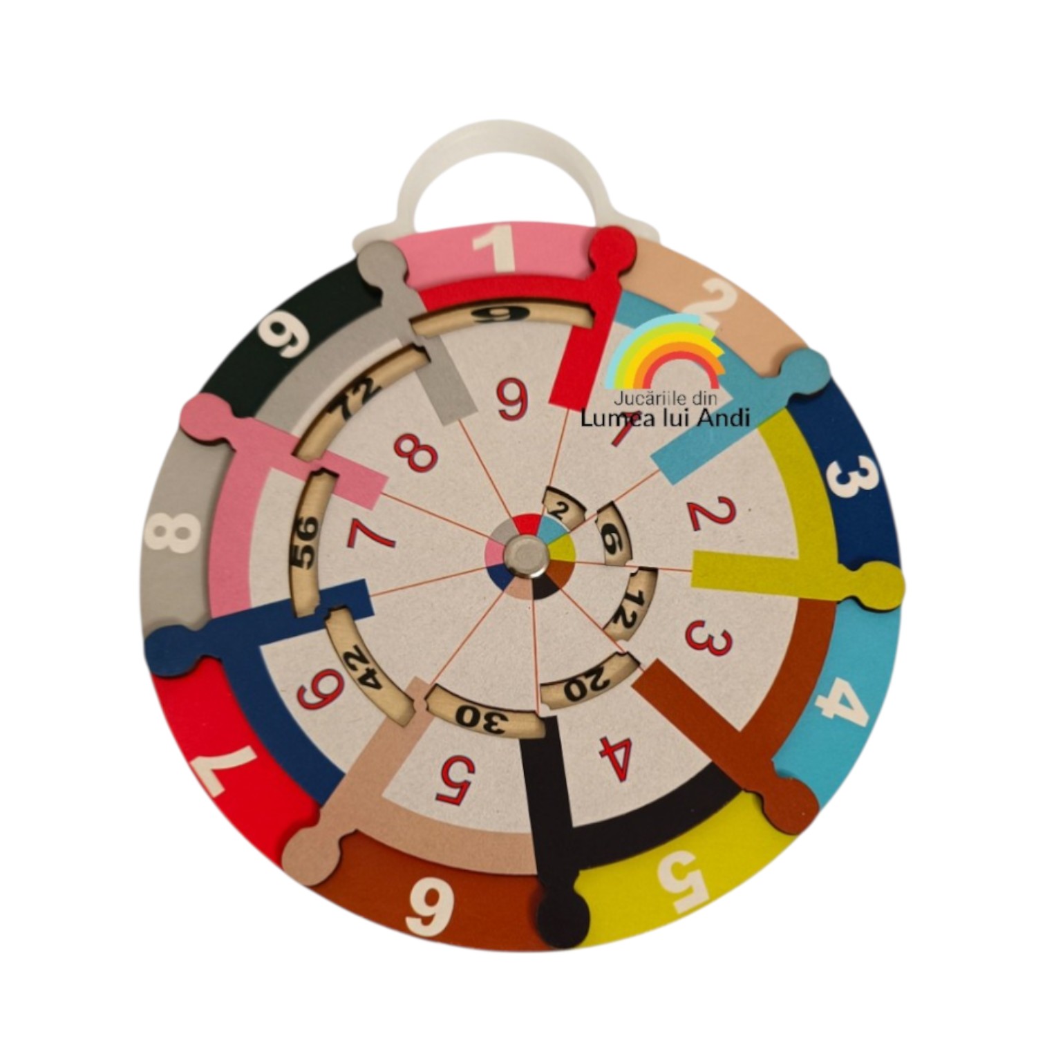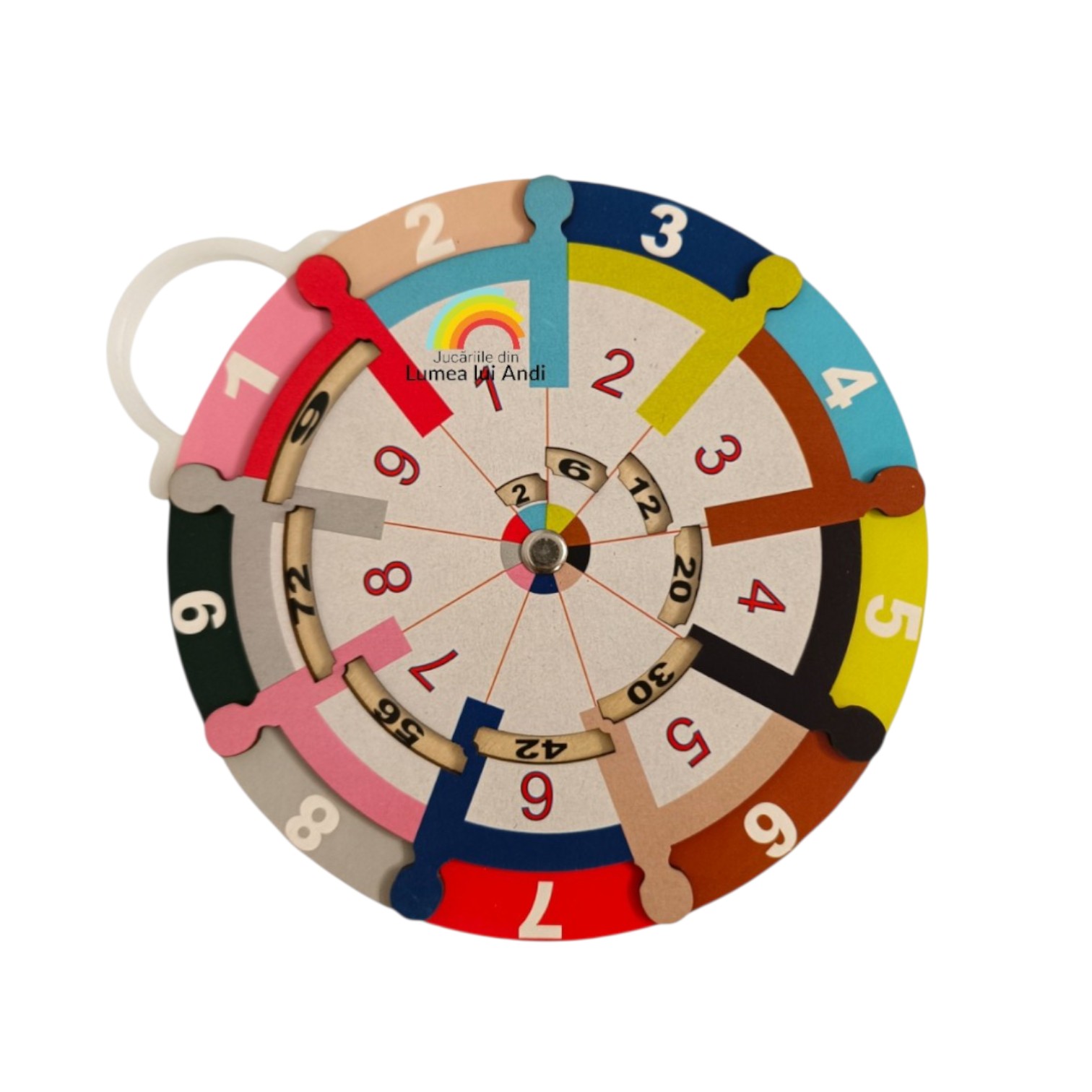 ✅Tabla înmulțirii – prin învârtirea roții centrale în orice direcție, cei mici pot învăța tabla înmulțirii de la 1 la 9, fiindcă se va obține în fiecare cadran rezultatul de la înmulțirea celorlalte 2 numere.