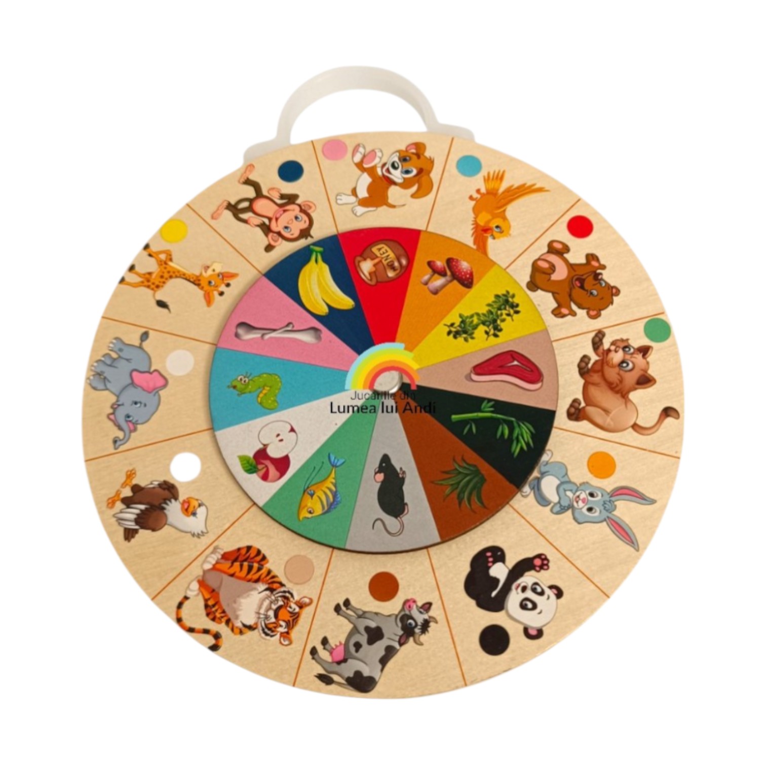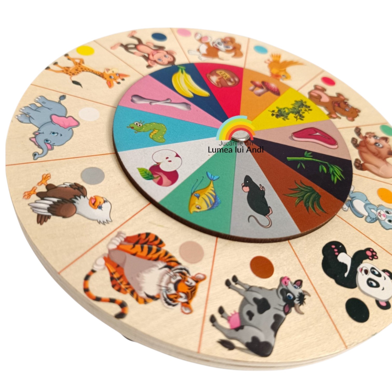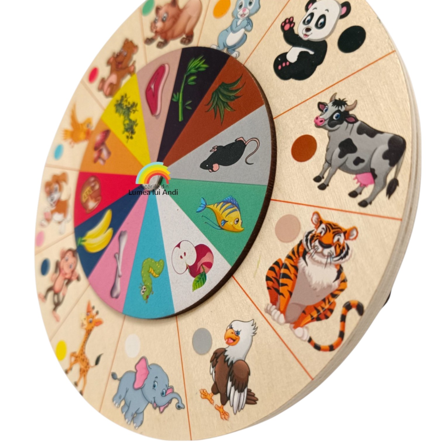 ✅Hrana animalelor – pe partea opusă a jocului cei mici vor descoperi un univers plin de animăluțe și alimentele lor preferate. Pentru a învăța hrana preferată a fiecărui animal, cei mici trebuie să rotească discul din centru pentru a asocia animalul cu hrana. Fiecare animal de pe suportul principal corespunde unei anumite culori, care indică alimentul potrivit de pe discul rotativ care este împărțit în felii de culori diferite.