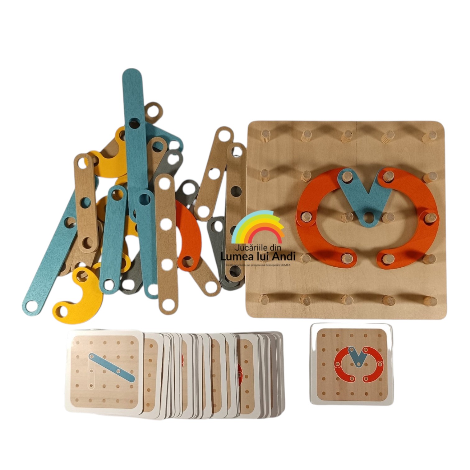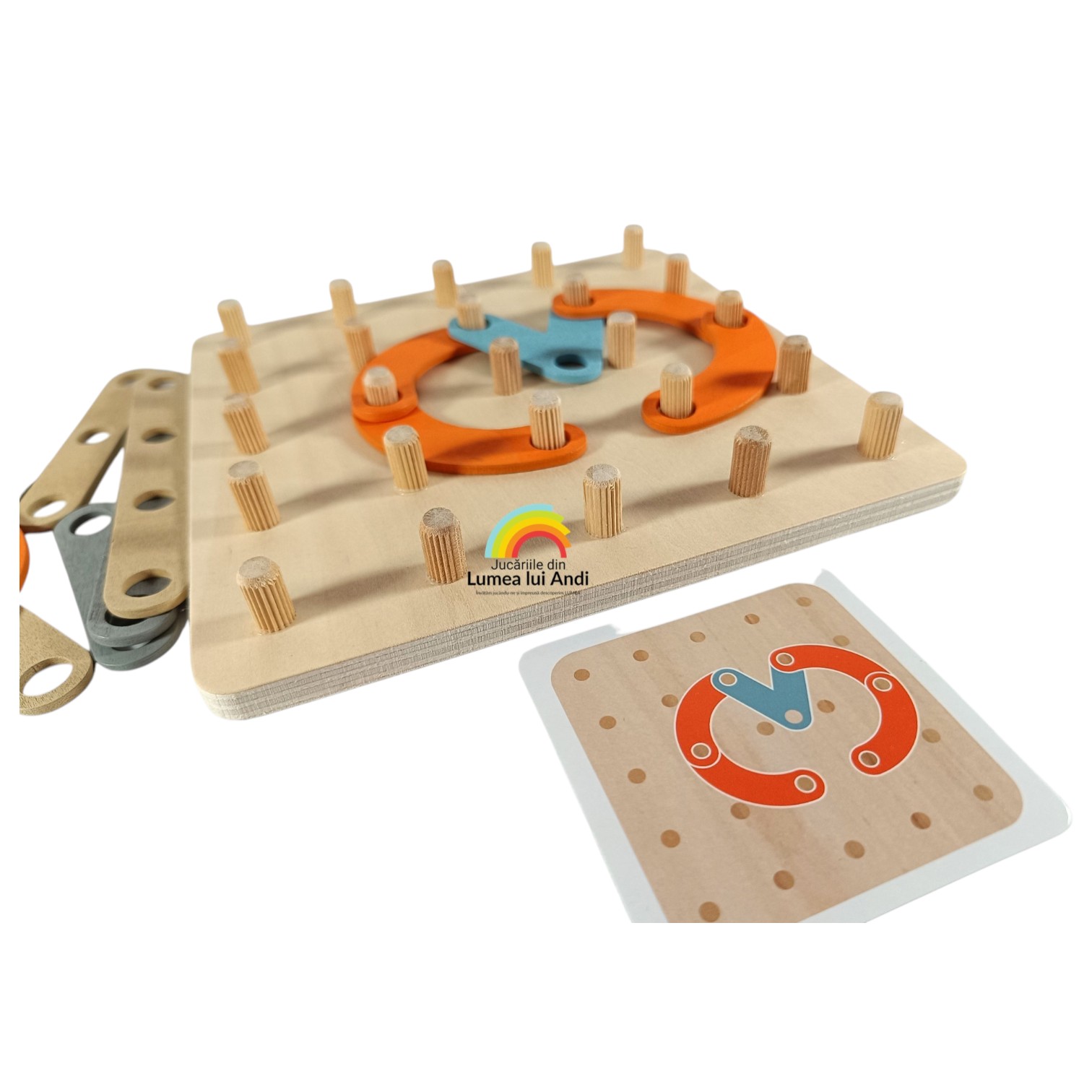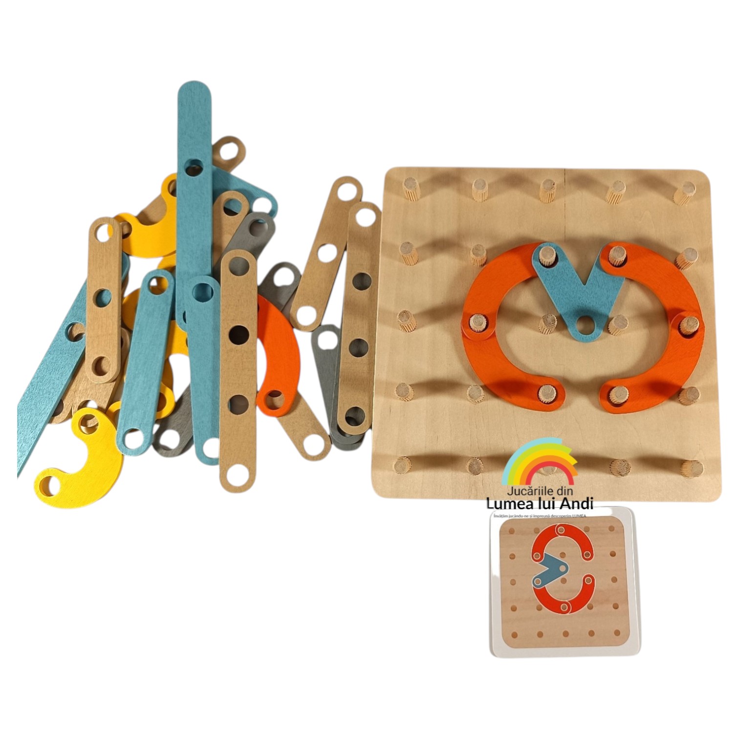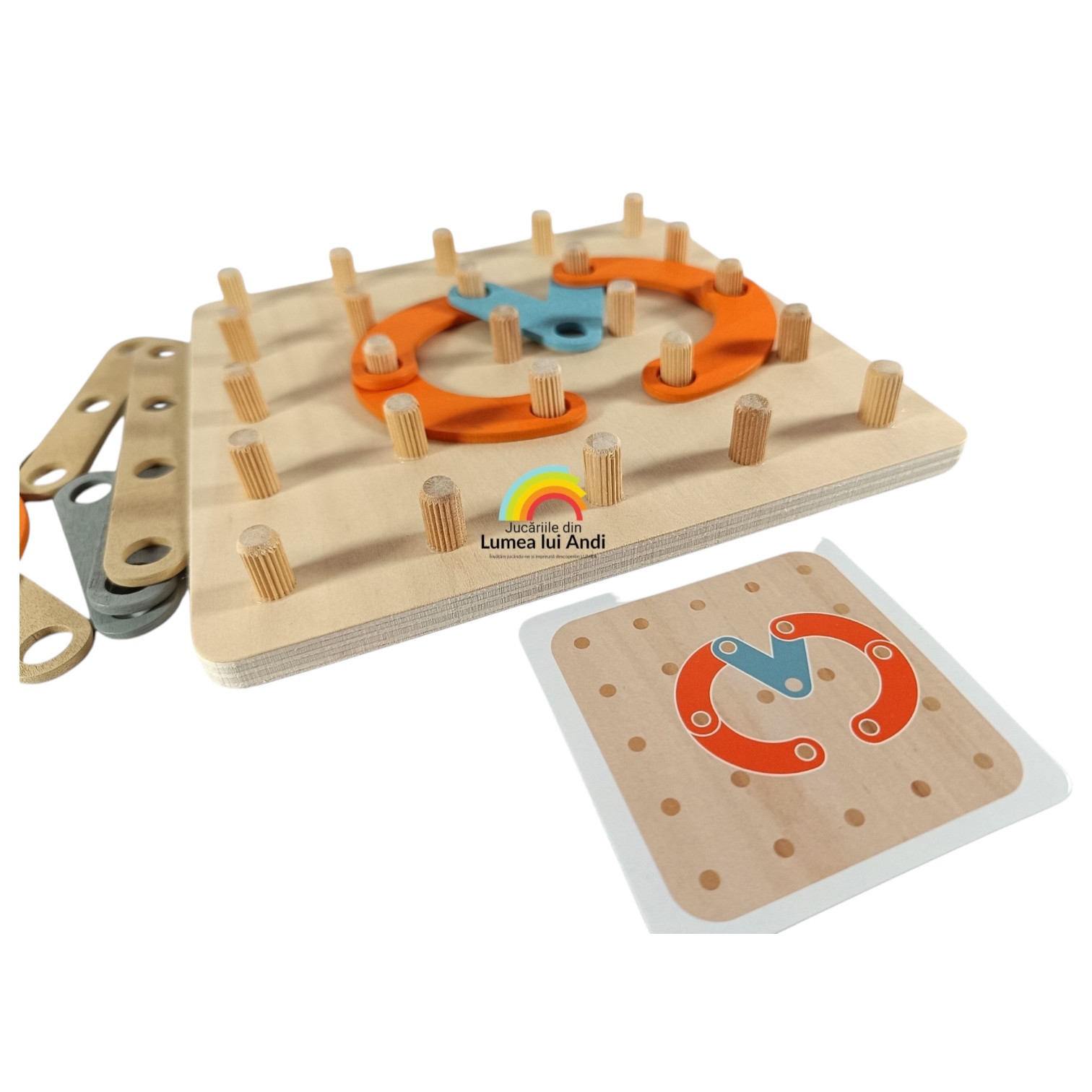 ✅planșă de joc din lemn tip geoboard cu 25 de pini din lemn pe care se îmbină piesele din lemn pentru a se forma modelul de pe cartonaș