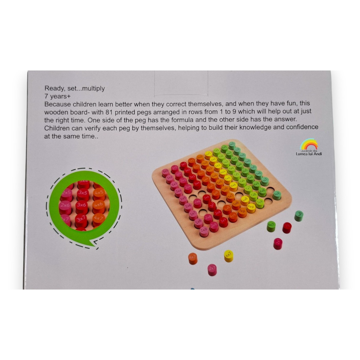 Tabla de joc din lemn include 81 de spații încastre, având o matrice de 9 pe 9, iar astfel se pot inmulți numerele pâna la obținerea rezultatului maxim 81. Fiecare rând de inmulțiri este colorat într-o singură culoare pentru a fi mai ușor de identificat piesele și pentru a nu le încurca între ele.