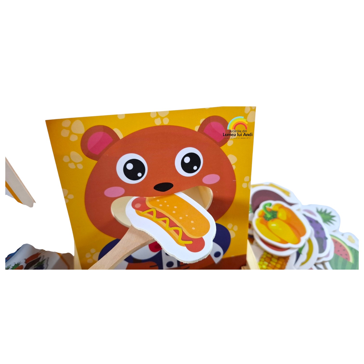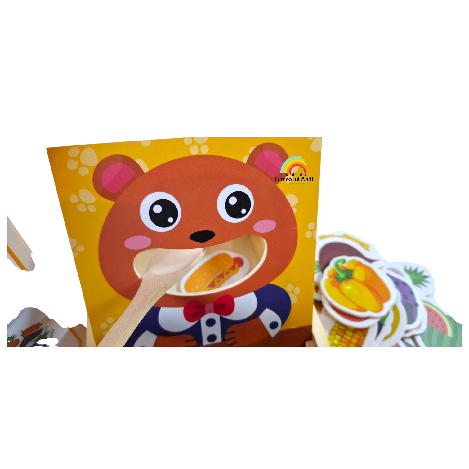 Acest joc educativ îi ajută pe cei mici să îți dezvolte abilitățile motorii fine, coordonarea ochi-mână, memoria, limbajul, precum și să învețe fructe, legume și alte alimente.