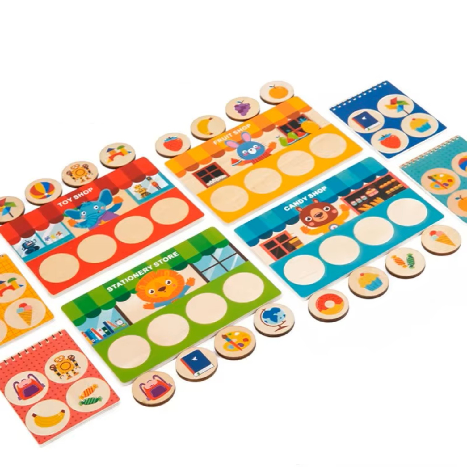 ✅4 planșe din lemn cu diferite tipuri de magazine (de jucării, de dulciuri, de fructe, de rechizite)