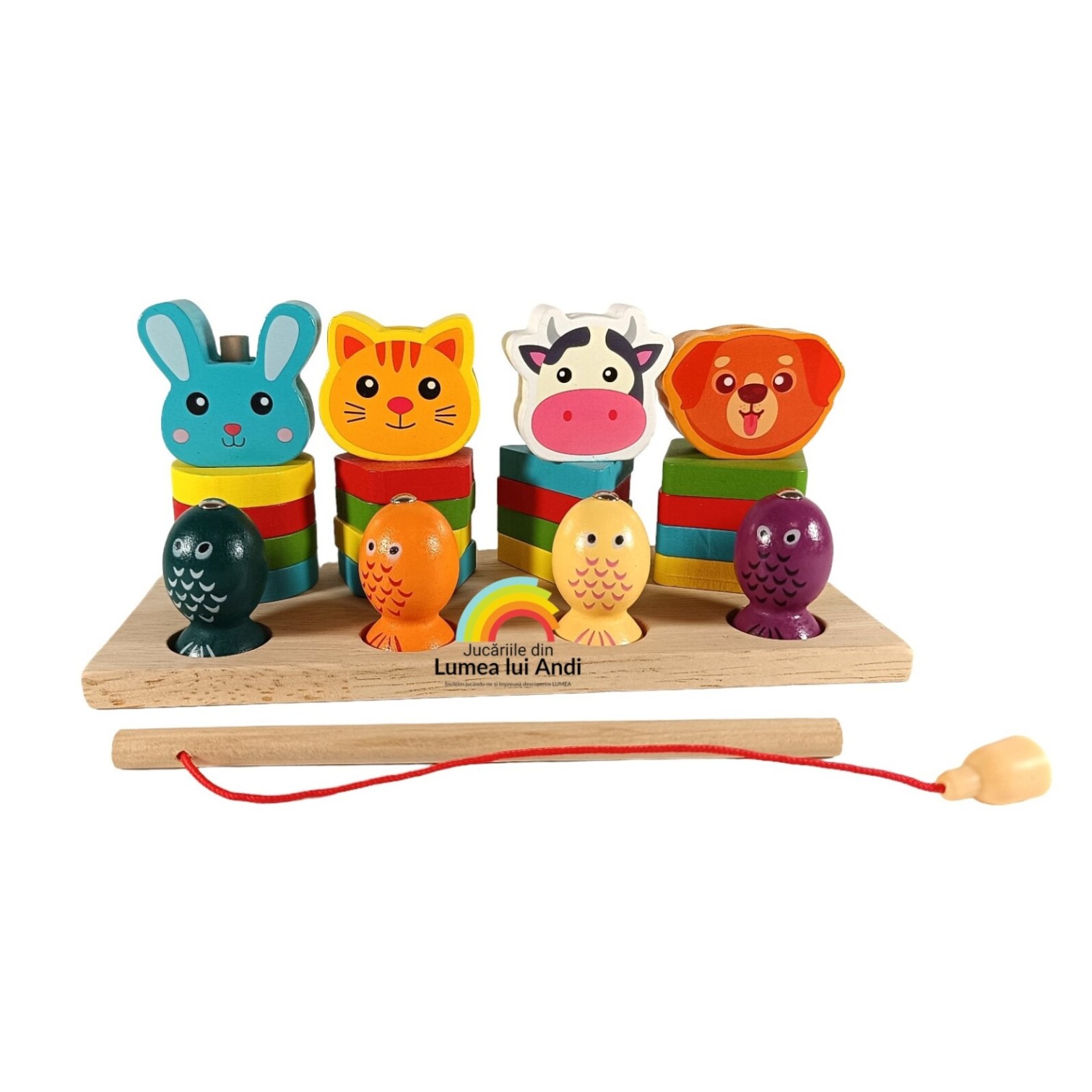 Joc Montessori 3 în 1, sortator cu văcuță și joc de pescuit și șnuruit