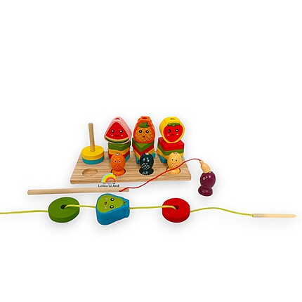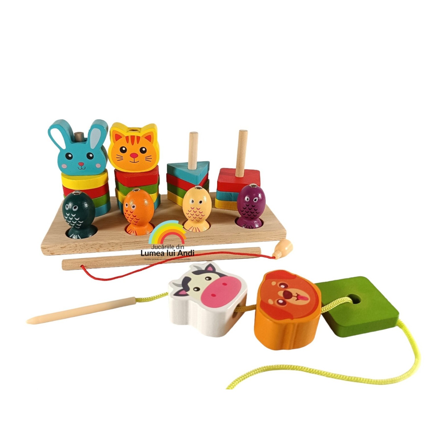Acest joc 3 în 1 este o combinație perfectă între sortatorul de forme geometrice cu 4 coloane și forme, jocul magnetic de pescuit și jocul de șnuruit. Sortatorul de forme geometrice ajută la recunoașterea și asocierea formelor, dezvoltând gândirea logică a copilașului, iar jocurile de pescuit și de șnuruit susțin coordonarea mână-ochi, îmbunatățesc dexteritatea fină și concentrarea.