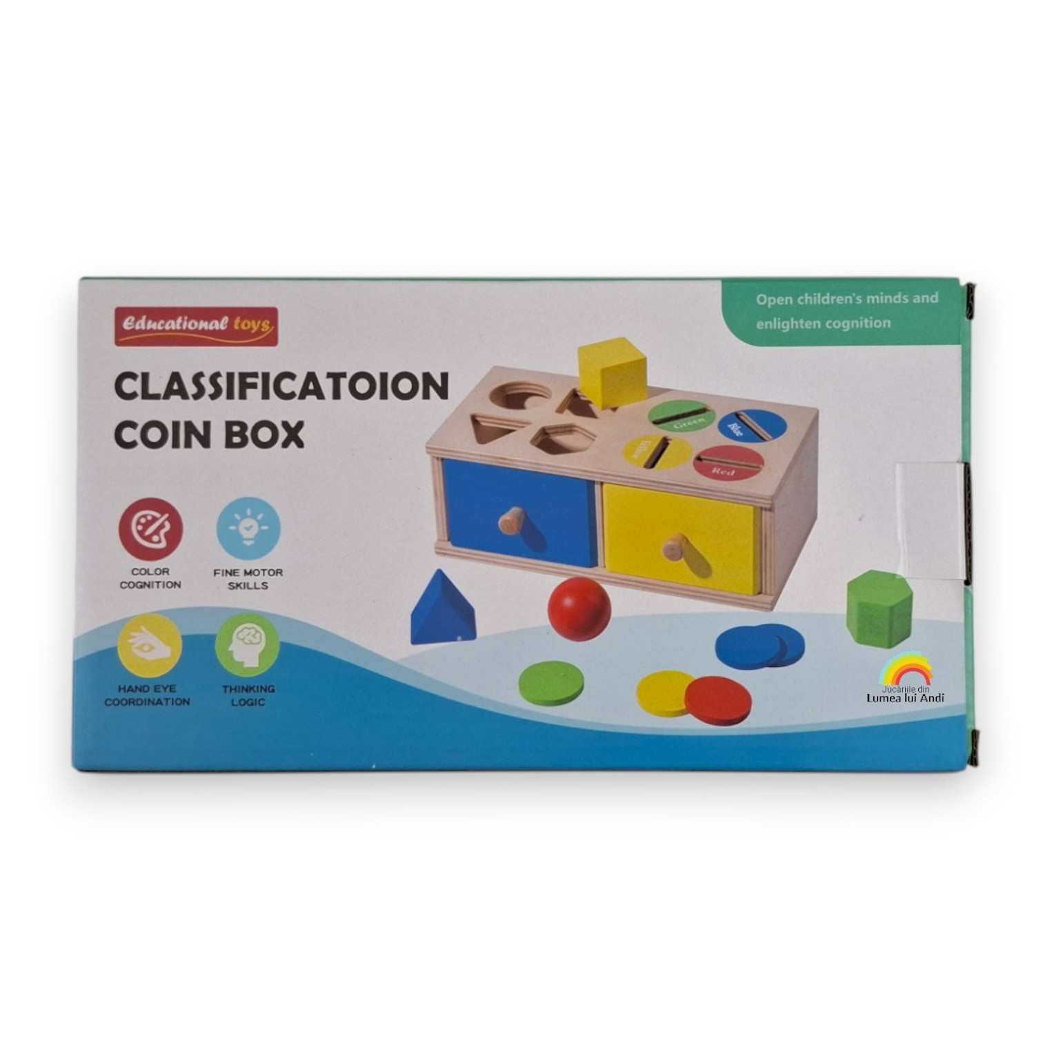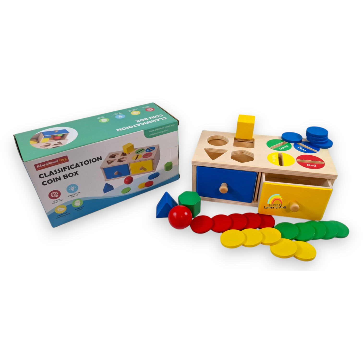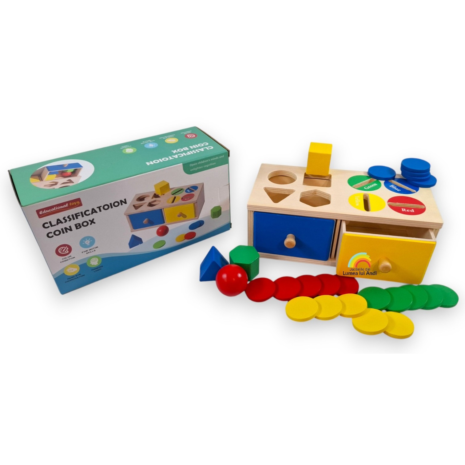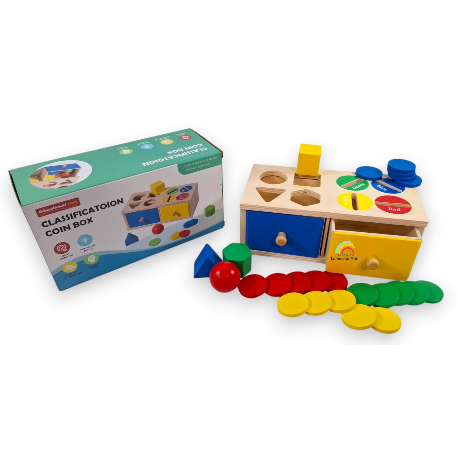 Cele 20 de jetoane sunt colorate în 4 culori diferite (câte 5 jetoane din fiecare culoare), iar cei mici trebuie să le asocieze corect cu culoarea din partea superioară a cutiei și să le introducă prin orificiul corespunzător. Jetoanele cad în interiorul cutiei, iar ulterior pot fi recuperate din sertarul corespunzător.
