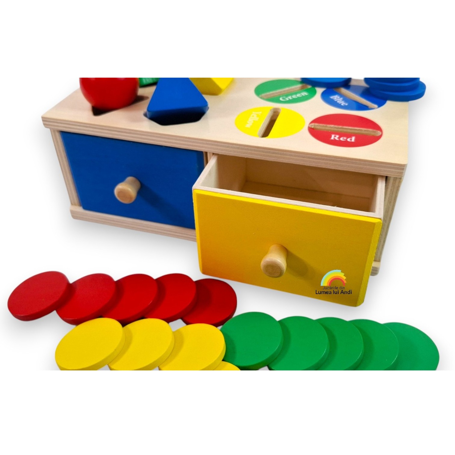 Joc Montessori din lemn de tipul cutia permanenței cu sertare, pentru sortare forme și culori