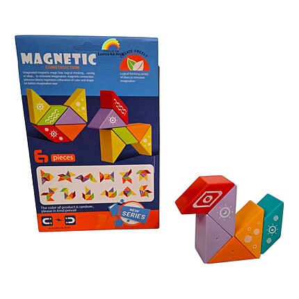 Acesta conține 60 de piese din lemn, de dimensiuni si forme diferite, pe care cei mici le pot folosi pentru a crea diverse modele, fie de pe fișa inclusă în set, fie din imaginația proprie.