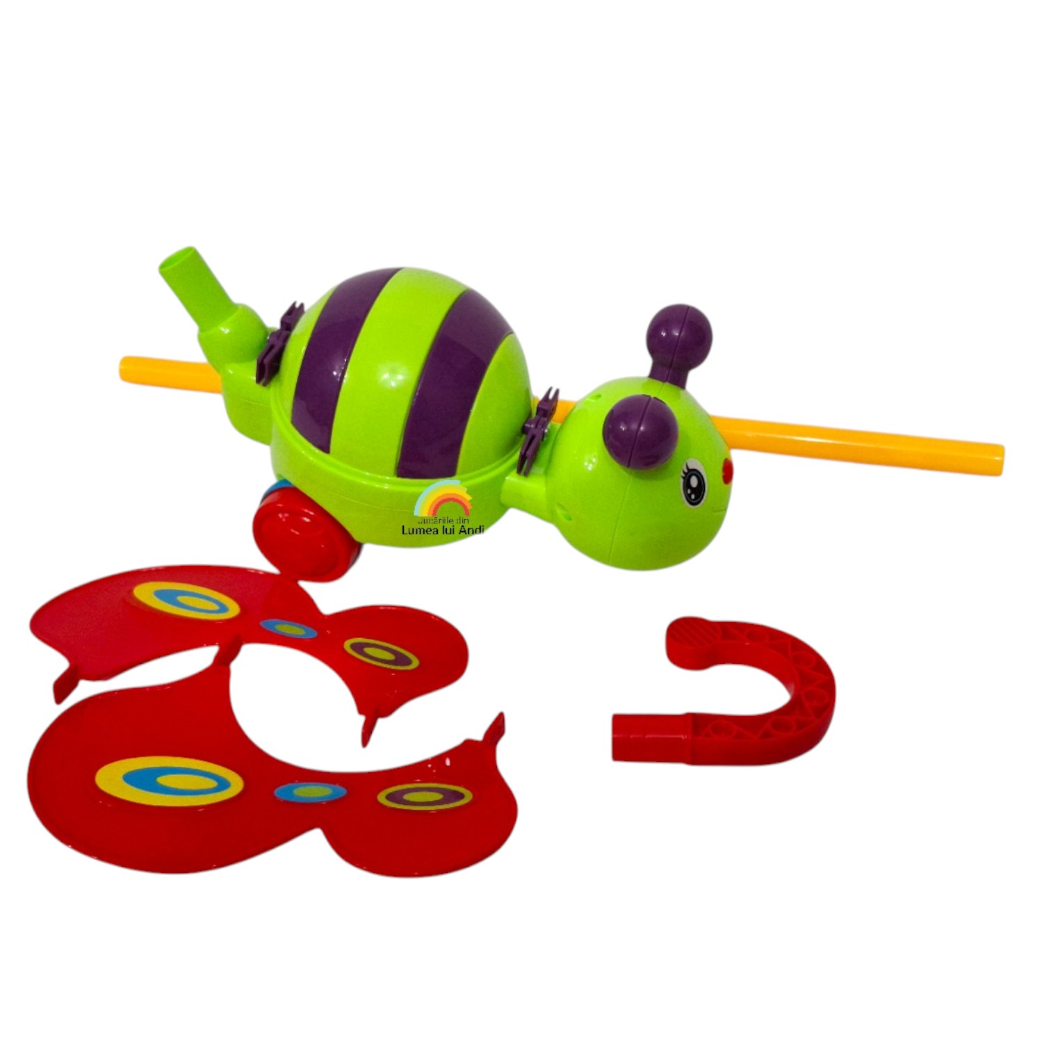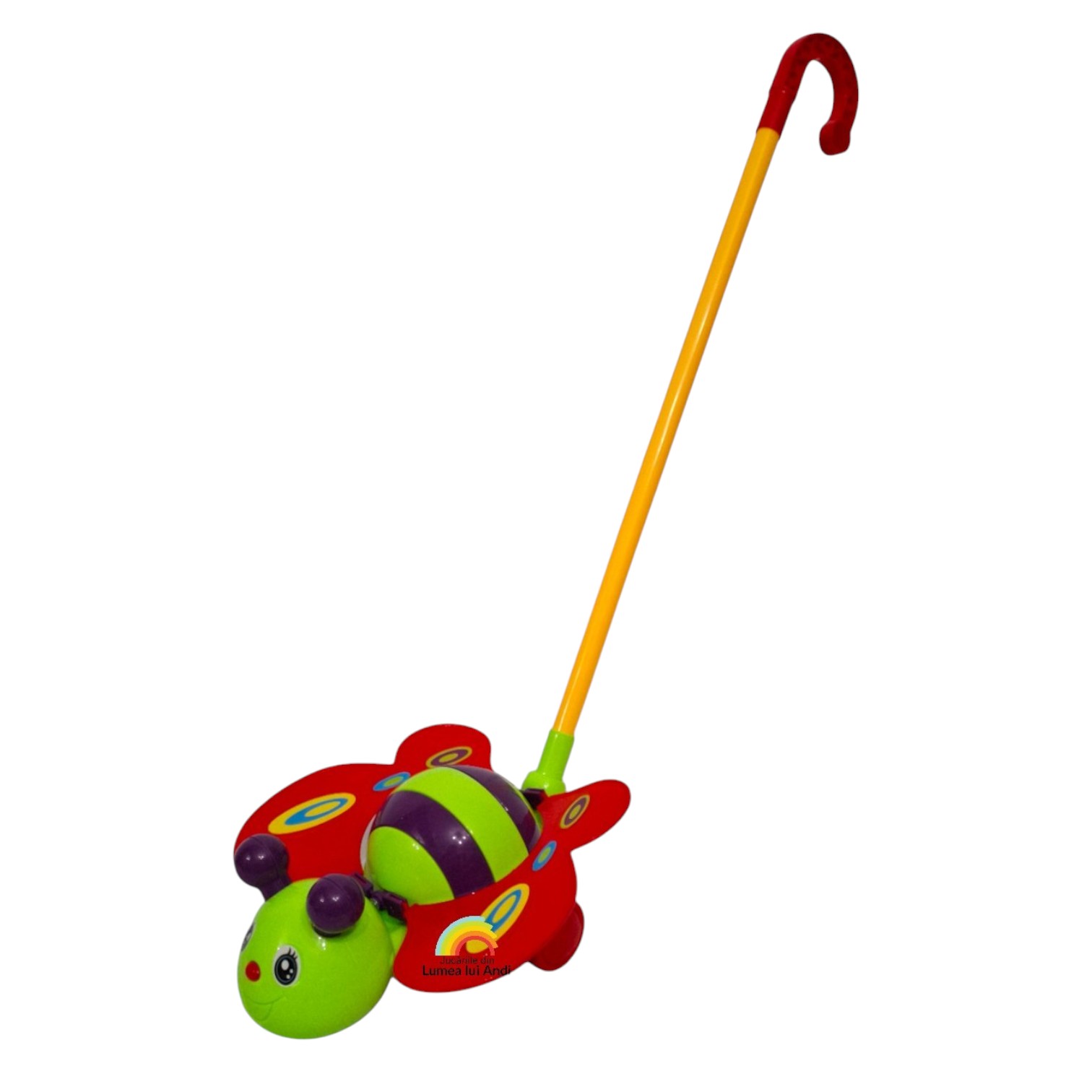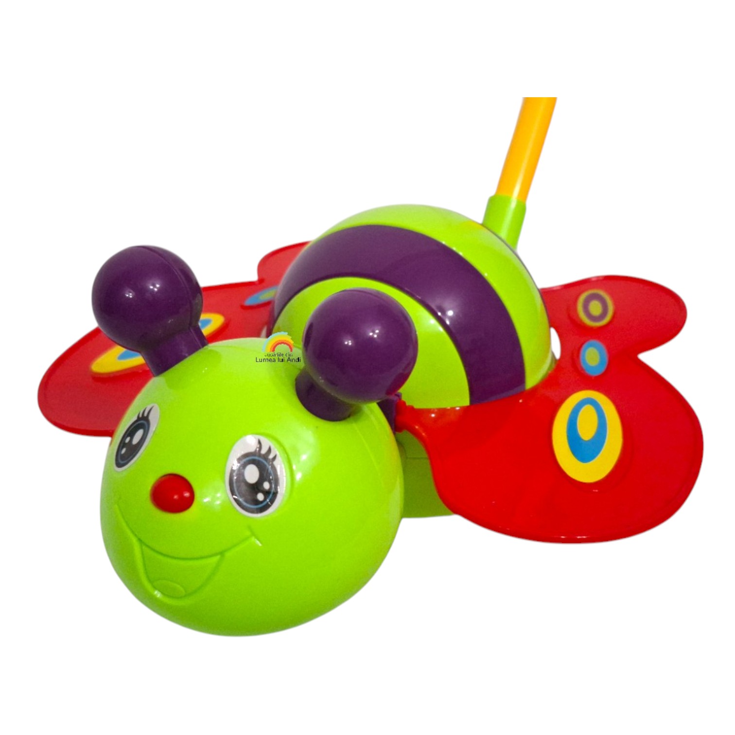 Această albinuță colorată flutură din aripi atunci când este împinsă și scoate un sunet de clopoțel, stimulând atât simțurile vizuale, cât și cele auditive ale celor mici. Este o jucărie în culori luminoase, cu piese mobile care încurajează mișcarea și exersarea abilităților motorii la bebeluși.