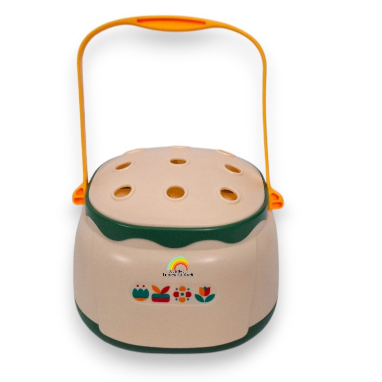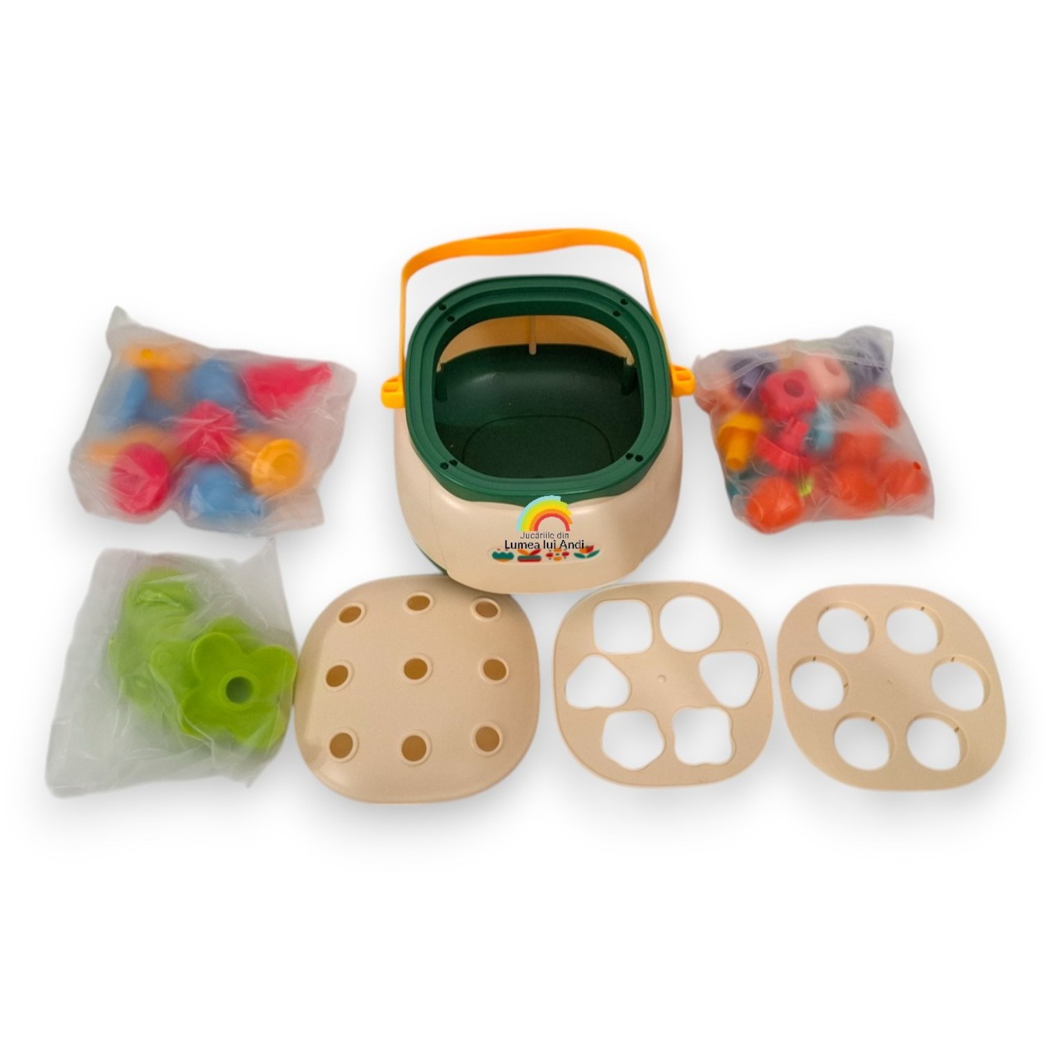 ✅ coșul din plastic cu mâner pe care se fixează 3 capace cu orificii. Poate fi folosit și pentru depozitarea pieselor după ce joaca s-a încheiat