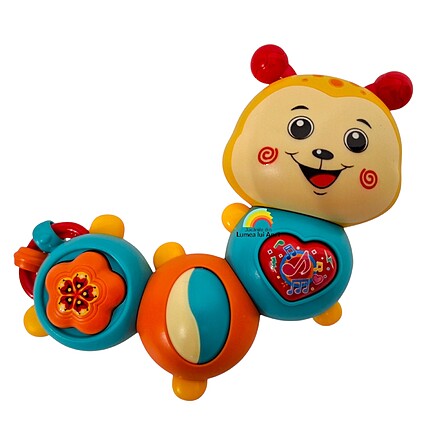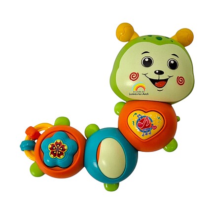 Aceasta este o jucărie interactivă, cu sunete și lumini, perfectă pentru stimularea simțurilor vizuale și auditive ale celor mici, dar și pentru dezvoltarea abilitătilor motorii fine și a coordonării ochi-mână. Bombonica îi va captiva pe cei mici prin diferite sunete, melodii vesele și efecte luminoase.