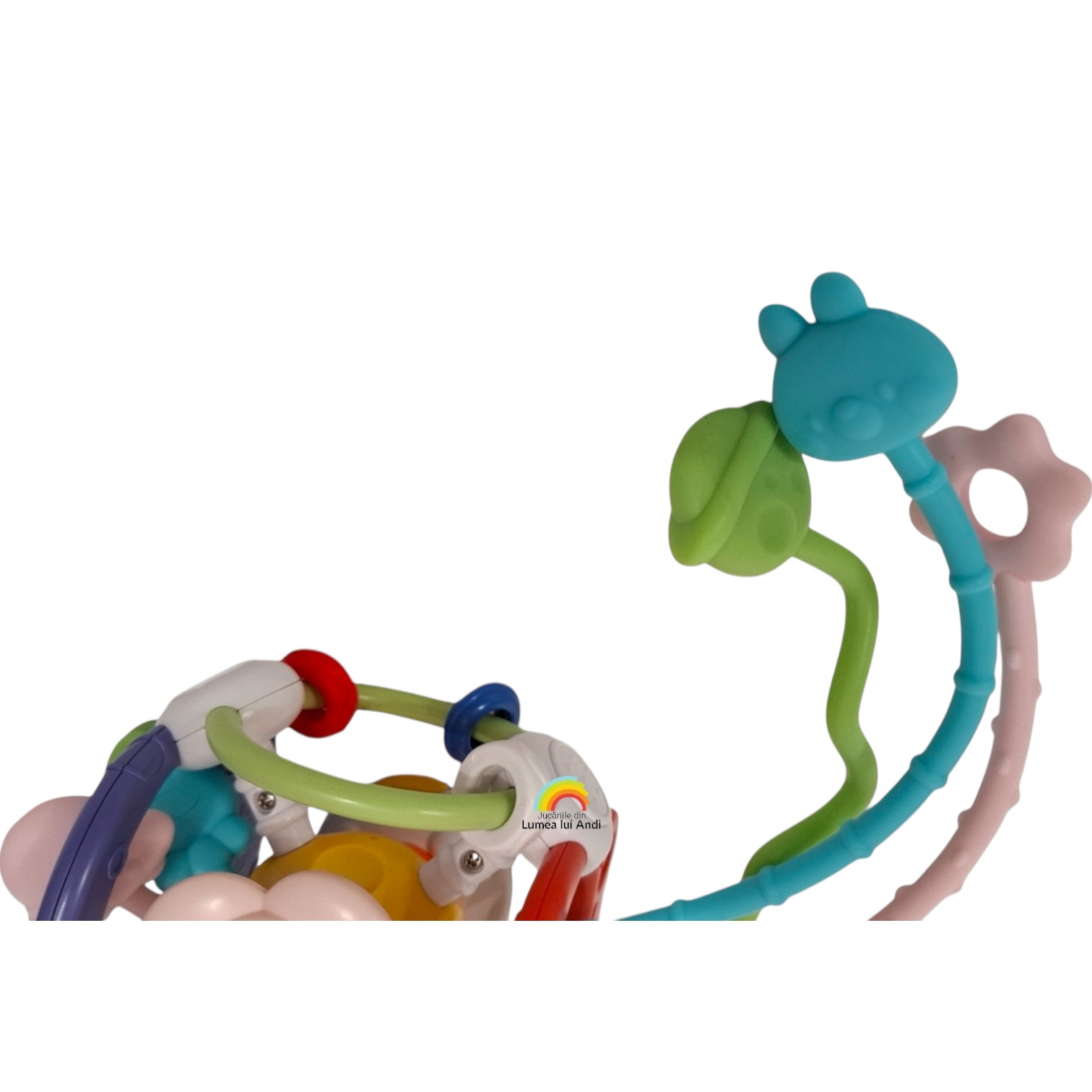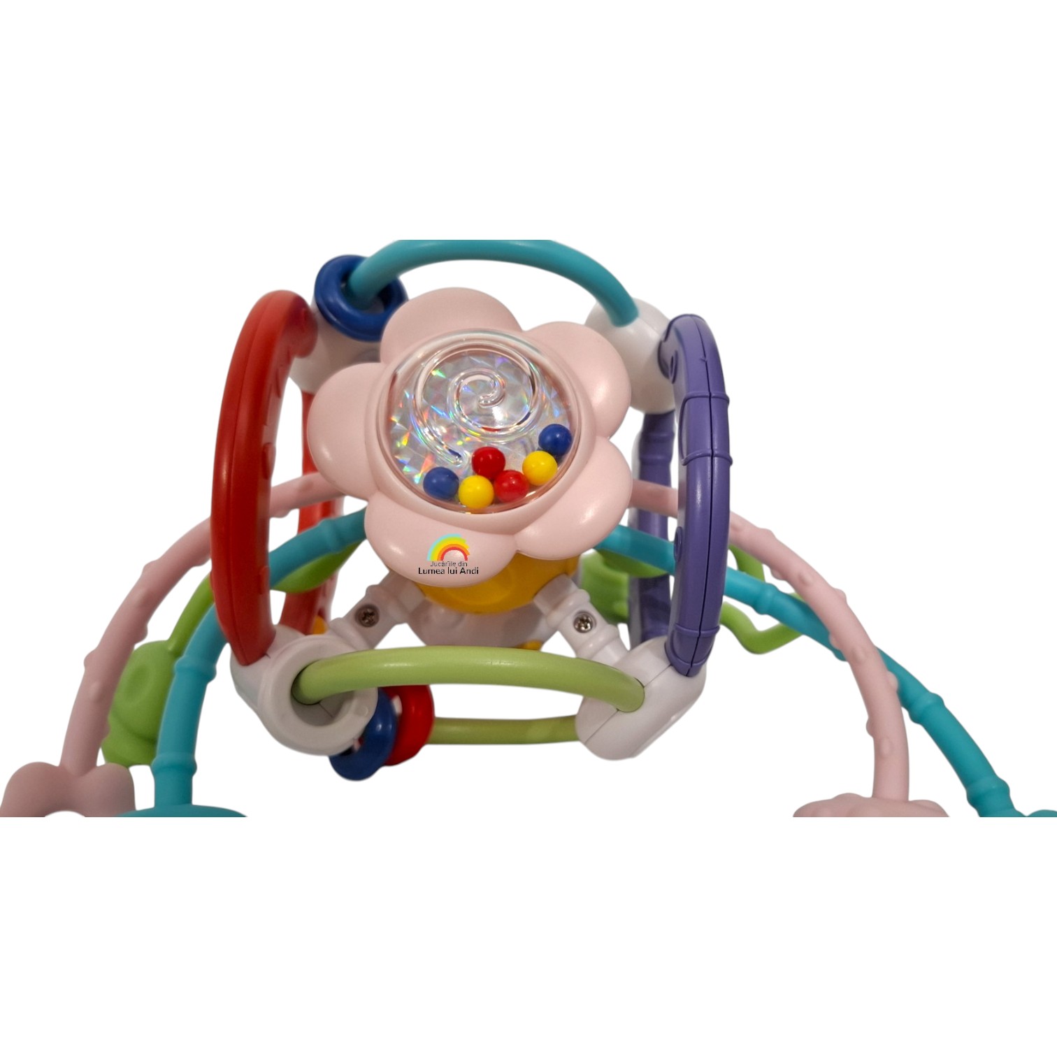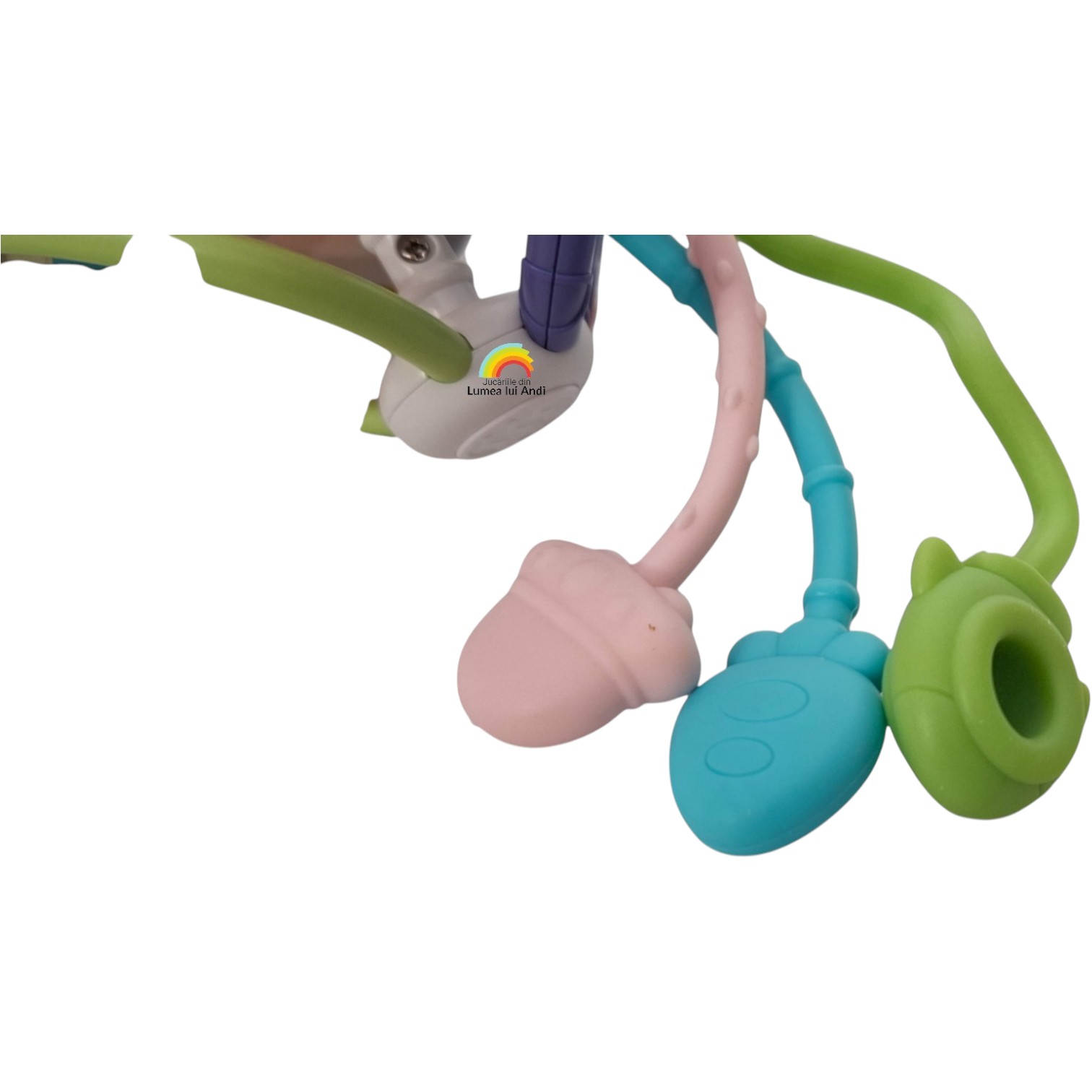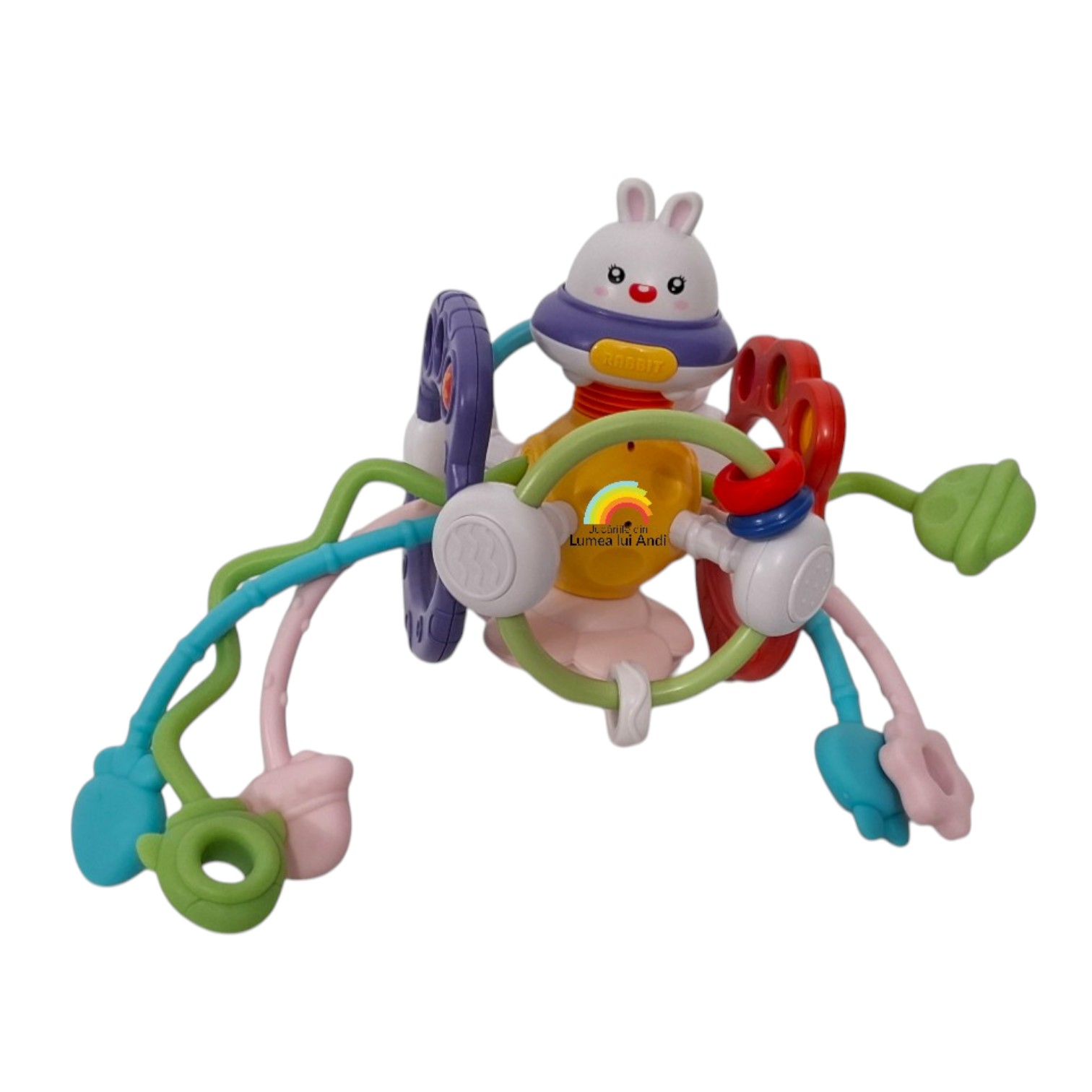 Iepurașul din partea superioară produce un sunet „chițăit” atunci când este apăsat, iar în partea de jos este o floare cu 5 biluțe colorate și produce un sunet atunci când este răsucită, oferindu-i și rolul de jucărie zornăitoare.