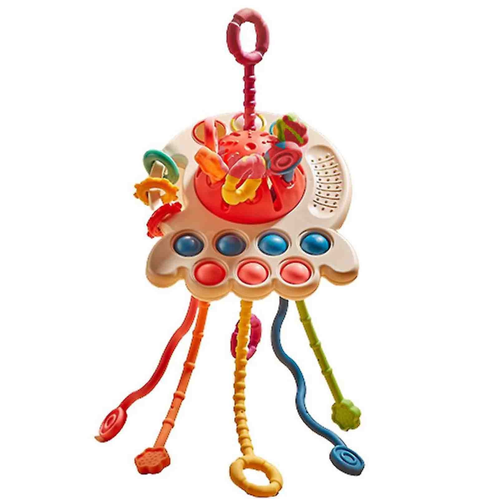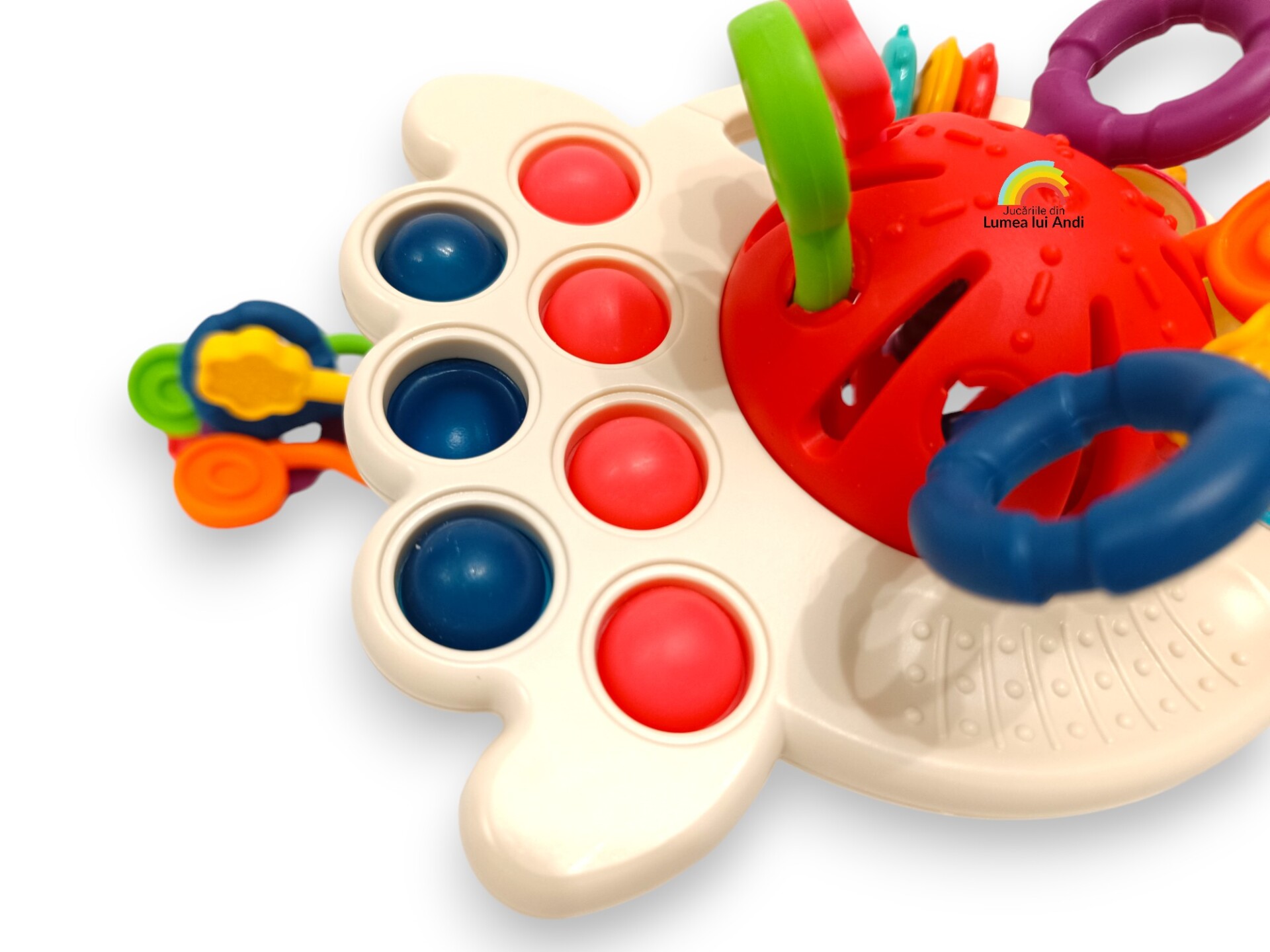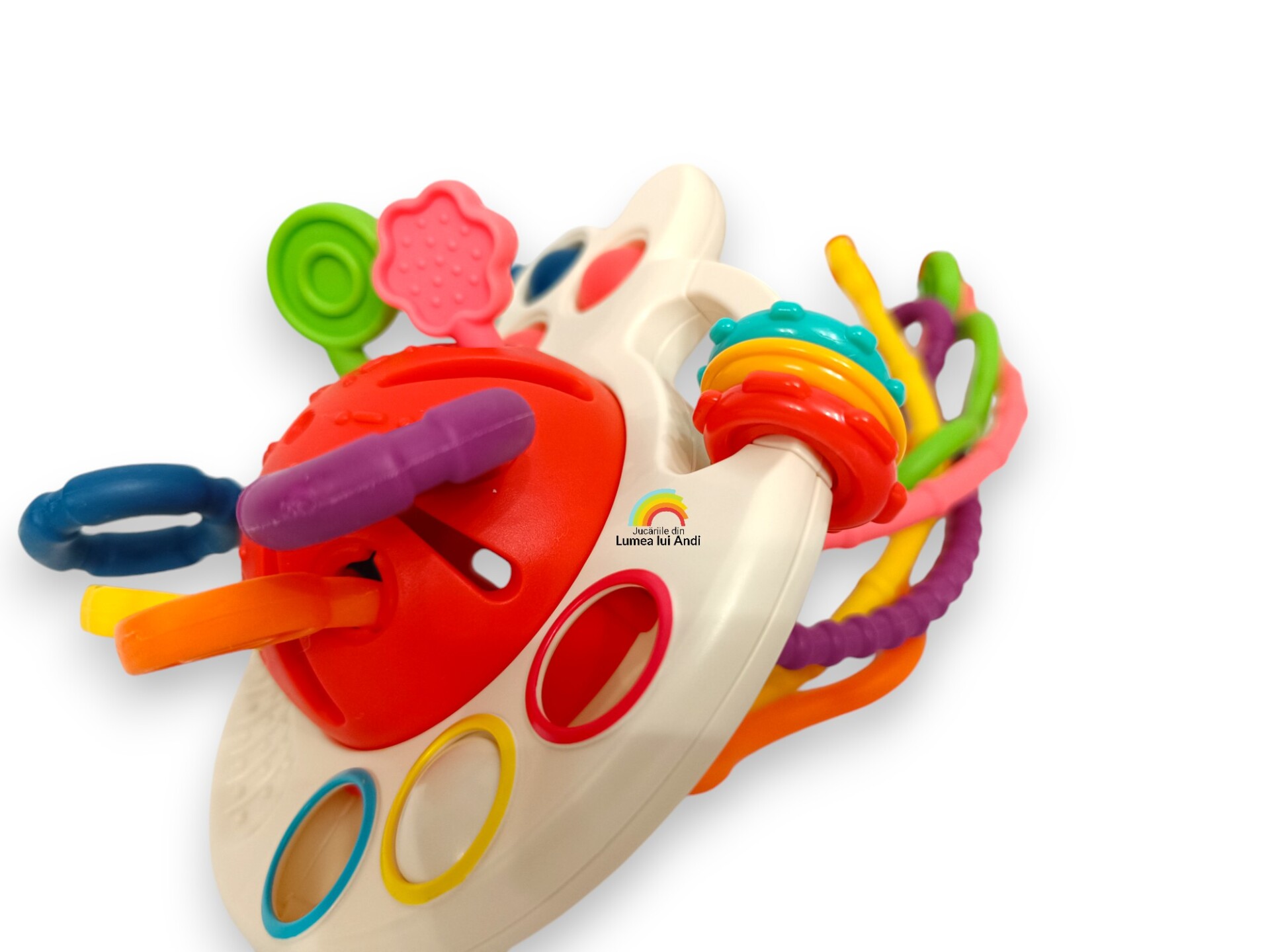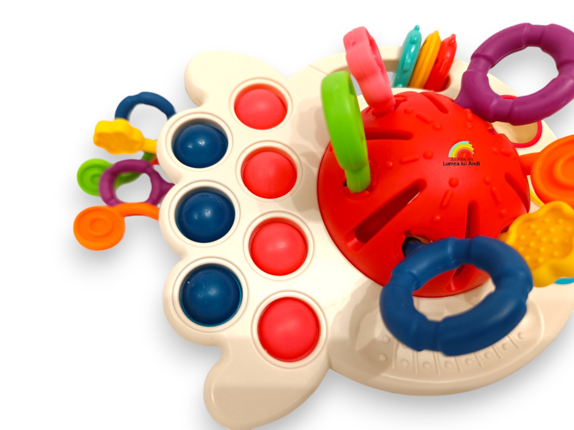 Această jucărie sub formă de OZN stimulează simțurile vizuale și tactile ale bebelușului, îl ajută să își dezvolte abilitățile motorii fine și să își îmbunătățească coordonarea ochi-mână, este ideală pentru joaca zilnică și explorarea senzorială, oferind în același timp alinare gingiilor sensibile.