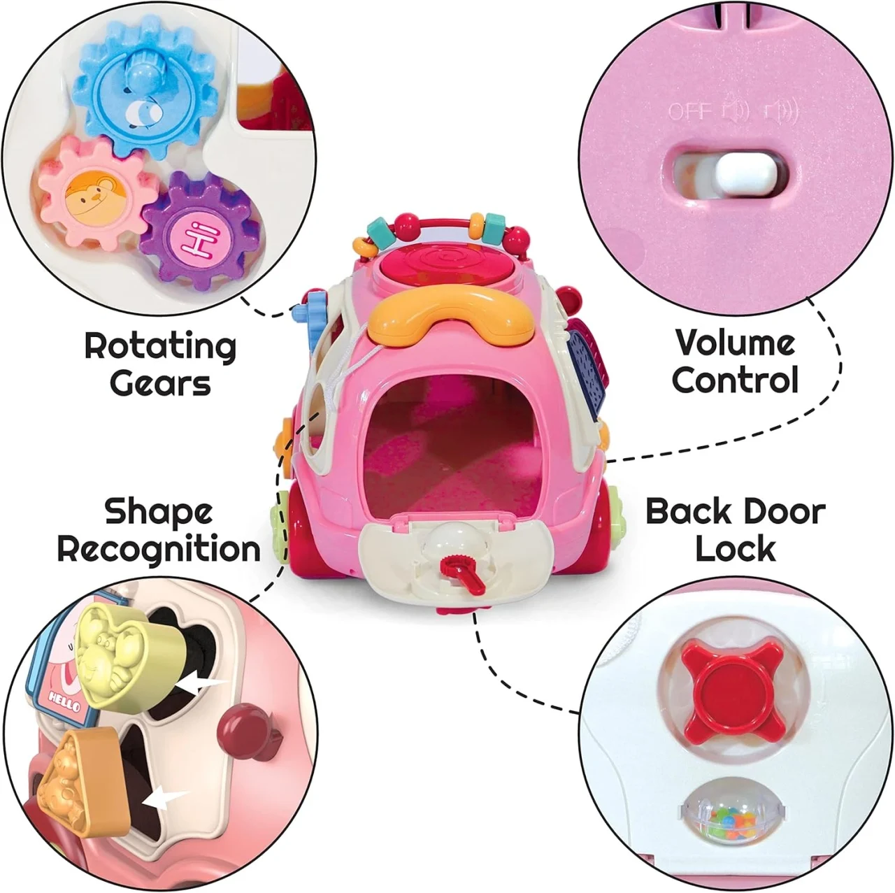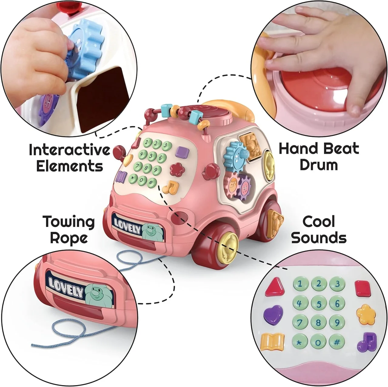 Această mașinuță este fabricată din plastic de înaltă calitate care rezistă la joaca intensă și poate fi folosită atât la interior, cât și la exterior, acasă, în mașină sau afară. Este o jucărie interactivă multifuncțională care încurajează explorarea și învățarea prin joacă, fiind jocul ideal pentru bebelușii plini de energie și curioși. Jocul stimulează simțurile vizuale, tactile și auditive ale celor mici și le permite să își dezvolte motricitatea într-un mod distractiv care îi va ține ocupați. De asemenea, încurajează jocul de rol și comunicarea cu ceilalți.