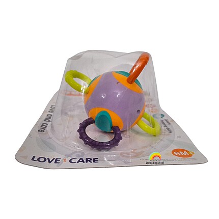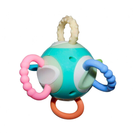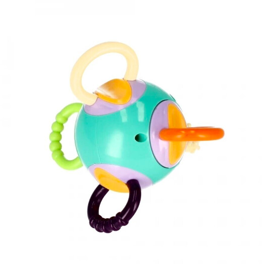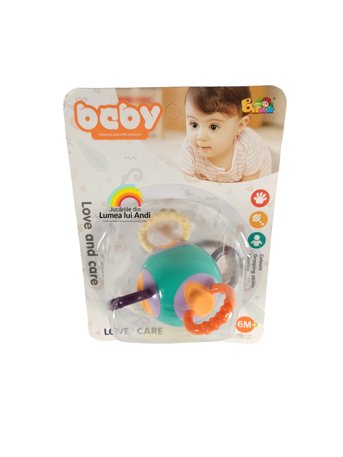 Această minge senzorială este o jucarie interactivă pentru bebeluși cu mici biluțe la interior, care îi oferă și rolul de jucărie zornăitoare. Conține 5 mânere prevăzute cu diferite striații, ce îi vor ajuta pe cei mici la dezzoltarea simțurilor tactile.
