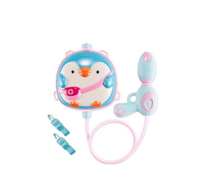 Acest joc cu apă care stropește este ideal în timpul verii când cei mici adoră să se joace cu apa. Pistolul se conectează printr-un furtun la ghiozdănelul sub formă de pinguin care se umple cu apă. După umplere, capacul rezervorului trebuie închis bine pentru a preveni scurgerea apei. Ghiozdănelul sub formă de Pinguin are bretele ajustabile pentru a se potrivi copilașilor de diferite vârste și are capacitatea de 1000 ml. Pistolul se acționează prin pompare, tâșnind apă la fiecare pompare.