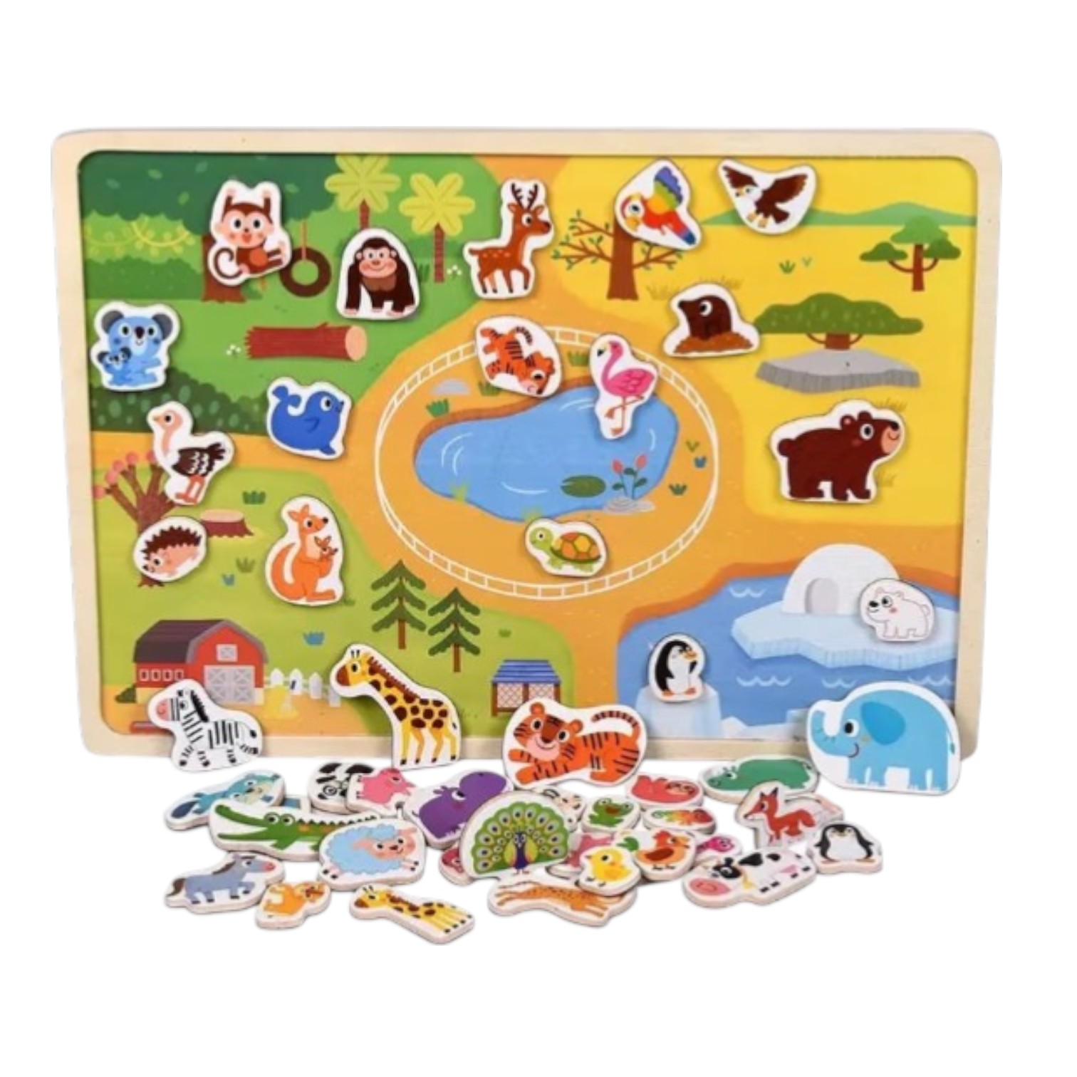 Această plansă magnetică din lemn ilustrează mediul de viață al animalelor (pădure, fermă, mediul acvatic, savană, Polul Nord) și conține 49 de piese magnetice cu diferite animale. Animalele magnetice sunt ușor de folosit pe orice suprafață metalică pe care aderă magneții. Acest joc este o modalitate excelentă prin care cei mici pot învăța despre diversitatea lumii animalelor, de a descoperi diferite specii și de a-i ajuta să înțeleagă importanța respectării naturii și vieții animalelor.