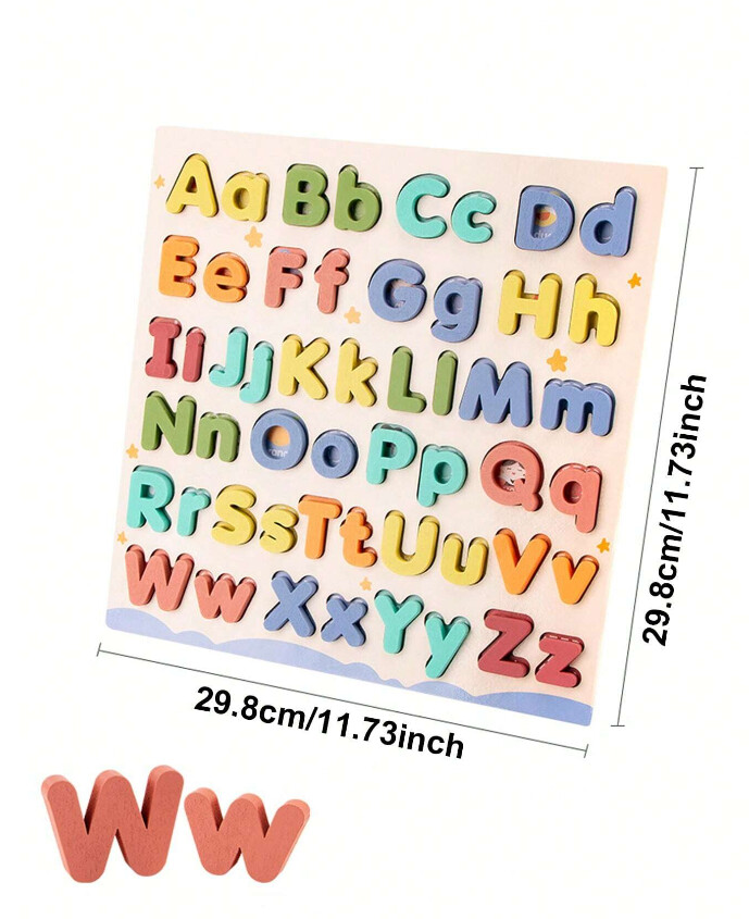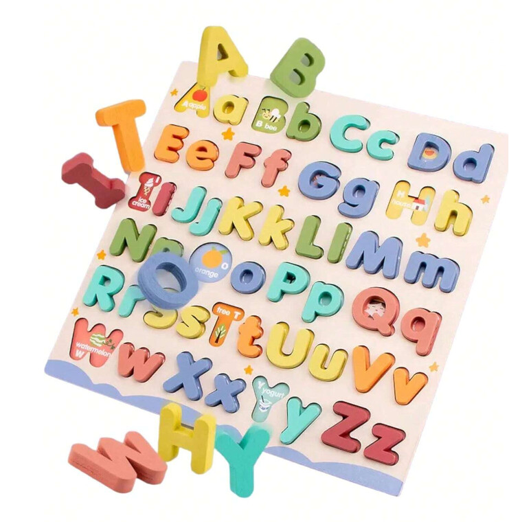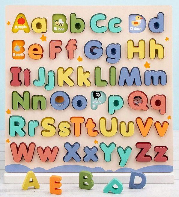Acest puzzle din lemn pentru învățarea literelor mari și mici este tip planșă cu spații încastre în care se pot potrivi cele 52 de piese (26 litere mari și 26 litere mici). Sub fiecare literă mare există o imagine cu un obiect care începe cu litera respectivă în limba engleză , precum și denumirea tot în limba engleză. Jocul dezvoltă atenția, memoria, concentrarea, coordonarea ochi-mână și precizia, stimulează abilitățile de potrivire și recunoaștere vizuală ale celor mici.
