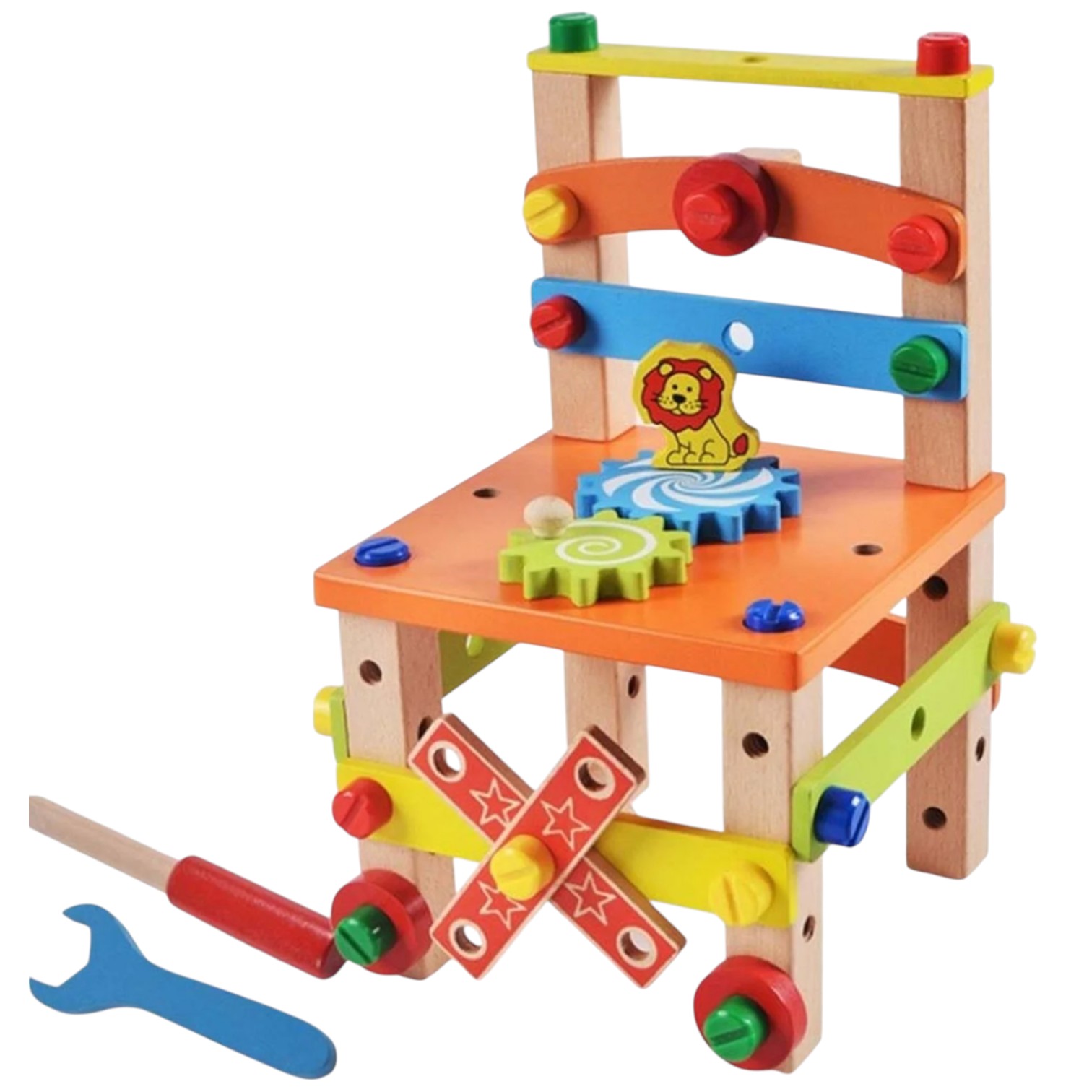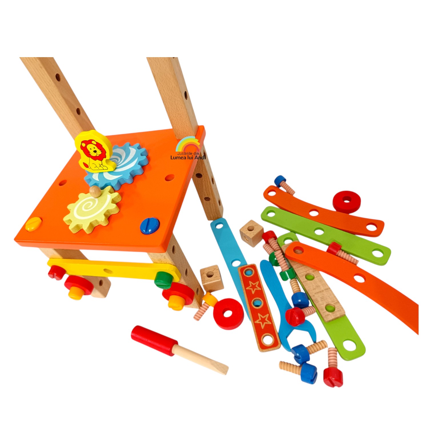 Scăunel. Jucărie educativă pentru asamblat tip banc de lucru, cu șuruburi din lemn și plastic