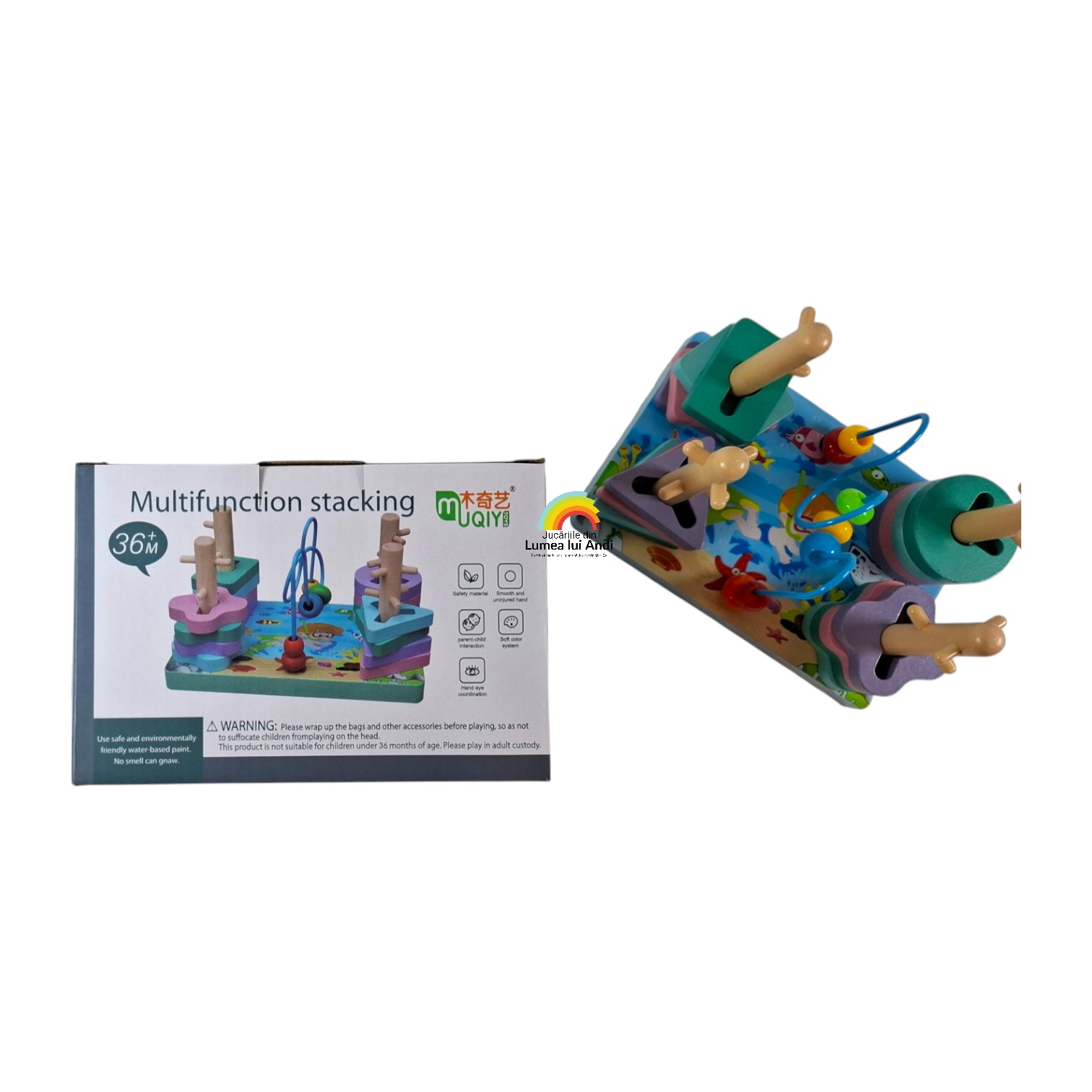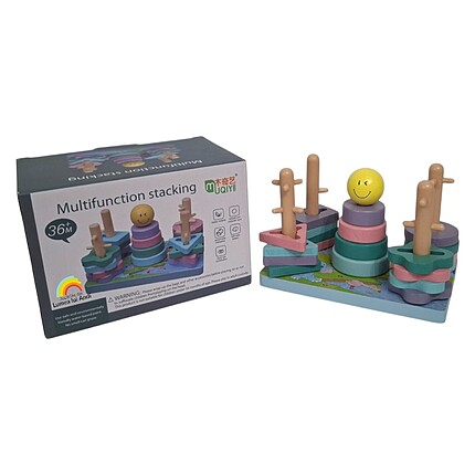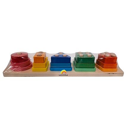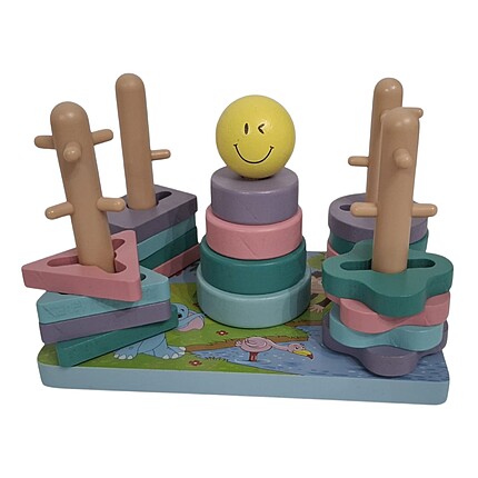 Acest sortator este format dintr-un suport de bază ce conține 4 tije din lemn pe care se pot sorta și stivui cele 16 de piese în diferite culori și forme geometrice (cerc, dreptunghi, triunghi și floare). precum și un mic labirint de motricitate cu 6 bile colorate. Cele patru tije conțin piedici, astfel cei mici trebuie să depună mai mult efort pentru a descoperi pe ce tijă se pot stivui piesele. Sortatorul îi învață pe cei mici să sorteze atât după forma geometrică, dar și după culoare.