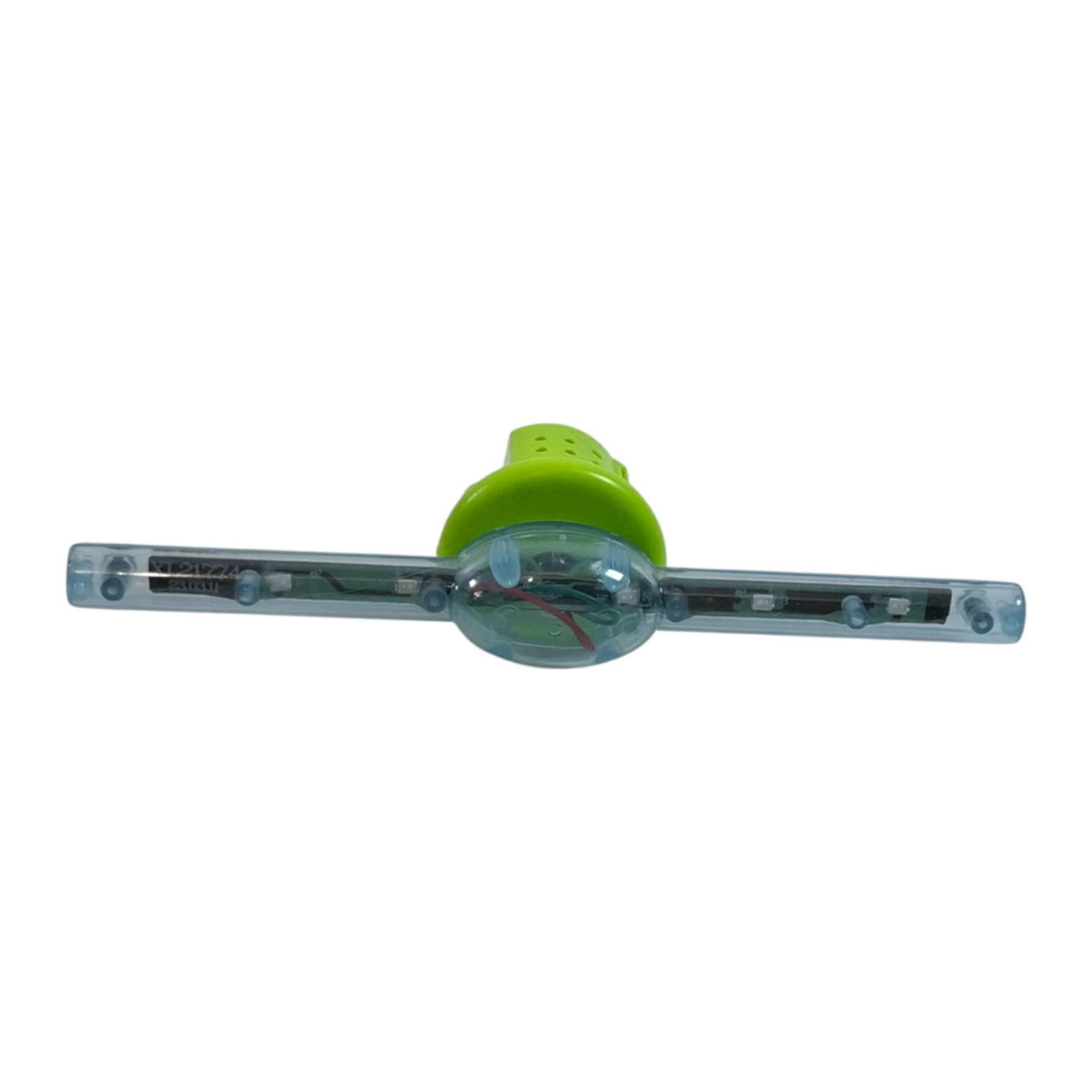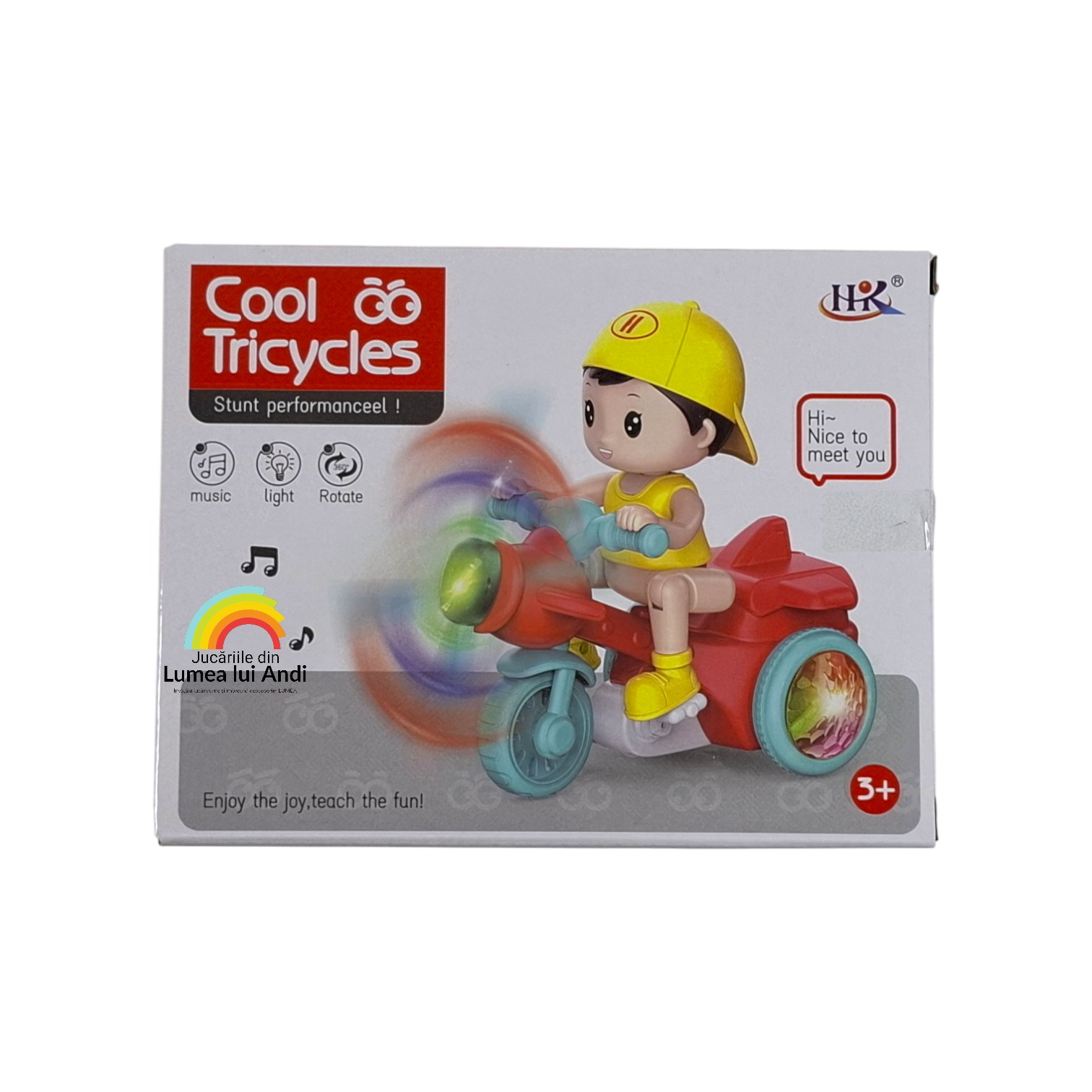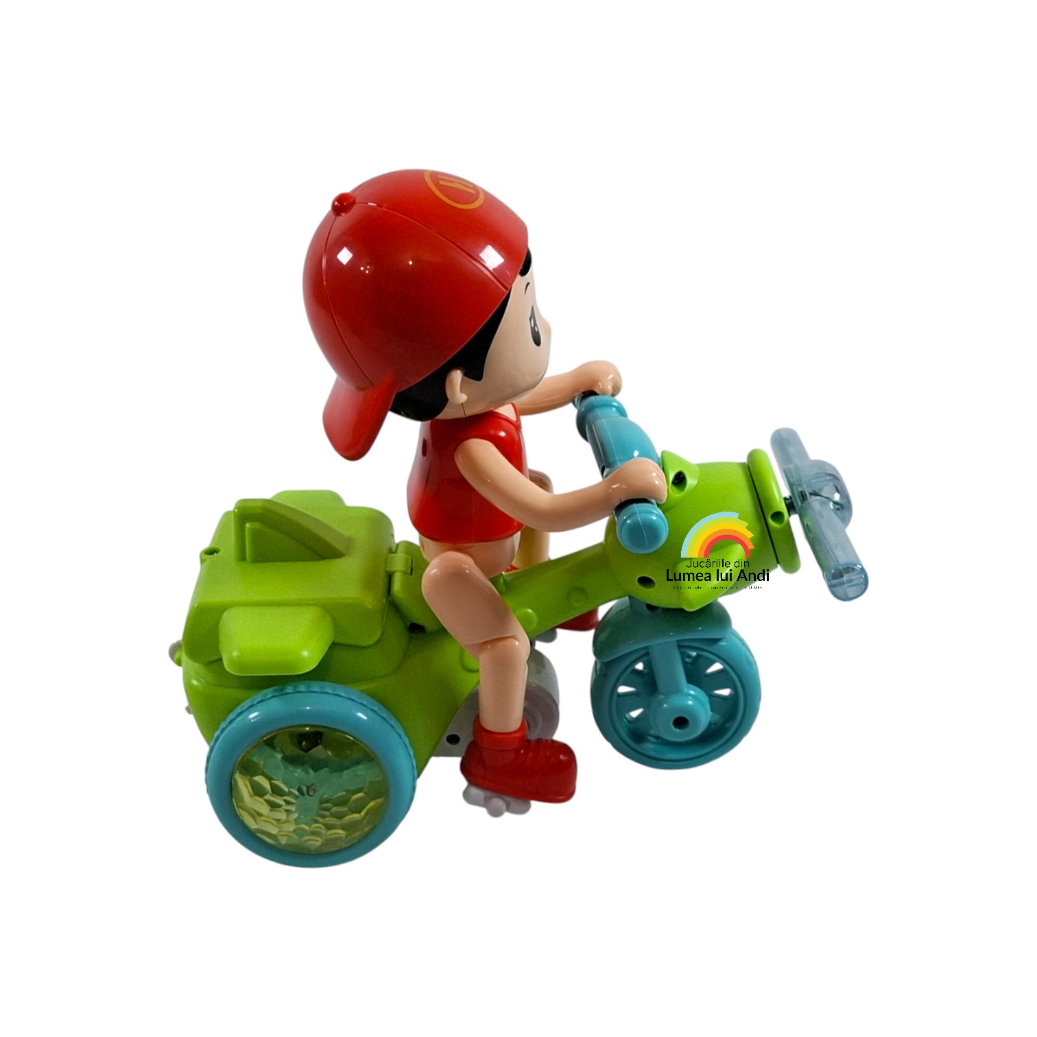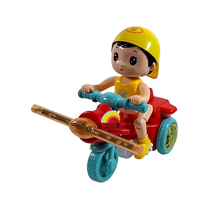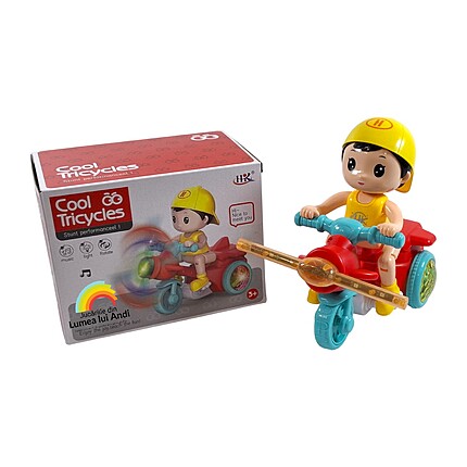 Cutia conține o tricicletă cu elice și o păpușică băiețel. Păpușa are picioarele cu articulații flexibile și se fixează pe tricicletă în 5 puncte (2 la picioare, 2 la mâini, 1 la posterior). După ce este pornit butonul din spatele tricicletei, jucăria cântă, se plimbă și se ridică pe cele 2 roți din spate spre încântarea celor mici.